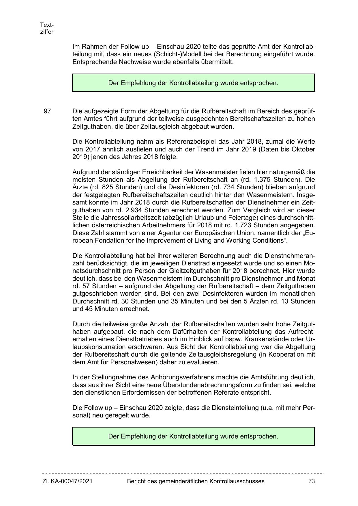 Durch die teilweise große Anzahl der Rufbereitschaften wurden sehr hohe Zeitguthaben aufgebaut, die nach dem Dafürhalten der Kontrollabteilung das Aufrechterhalten eines Dienstbetriebes auch im Hinblick auf bspw. Krankenstände oder Urlaubskonsumation erschweren. Aus Sicht der Kontrollabteilung war die Abgeltung