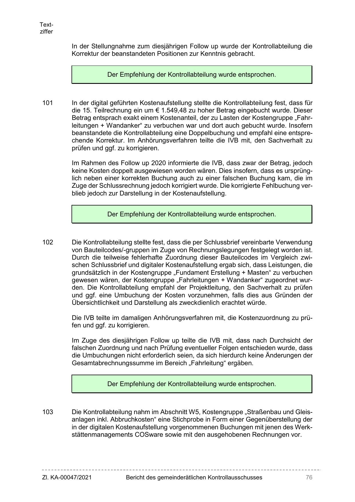 gewesen wären, der Kostengruppe „Fahrleitungen + Wandanker“ zugeordnet wurden. Die Kontrollabteilung empfahl der Projektleitung, den Sachverhalt zu prüfen