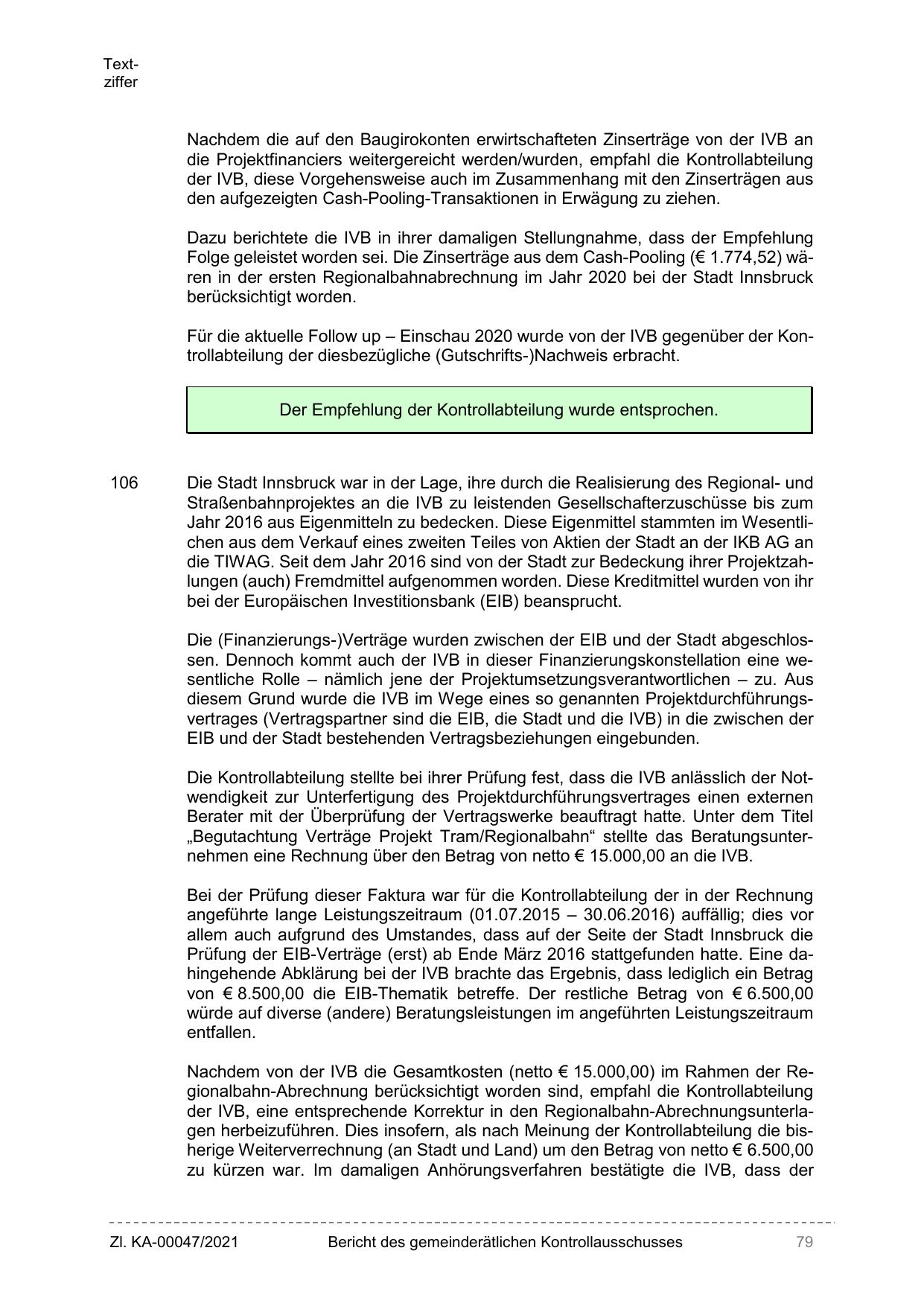Prüfung der EIB-Verträge (erst) ab Ende März 2016 stattgefunden hatte. Eine dahingehende Abklärung bei der IVB brachte das Ergebnis, dass lediglich ein Betrag