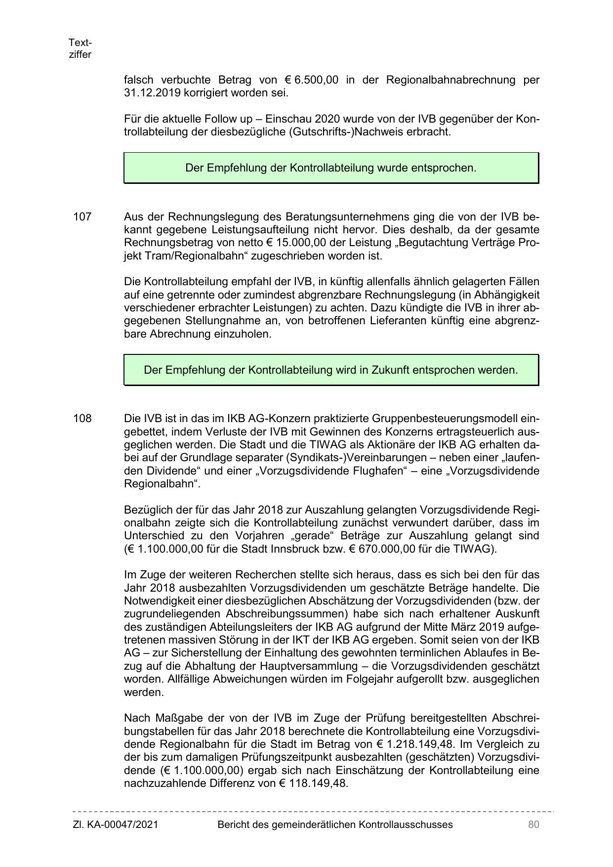 Für die aktuelle Follow up – Einschau 2020 wurde von der IVB gegenüber der Kontrollabteilung der diesbezügliche (Gutschrifts-)Nachweis erbracht.