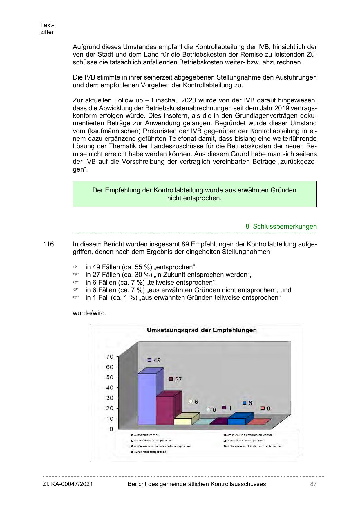 In diesem Bericht wurden insgesamt 89 Empfehlungen der Kontrollabteilung aufgegriffen, denen nach dem Ergebnis der eingeholten Stellungnahmen