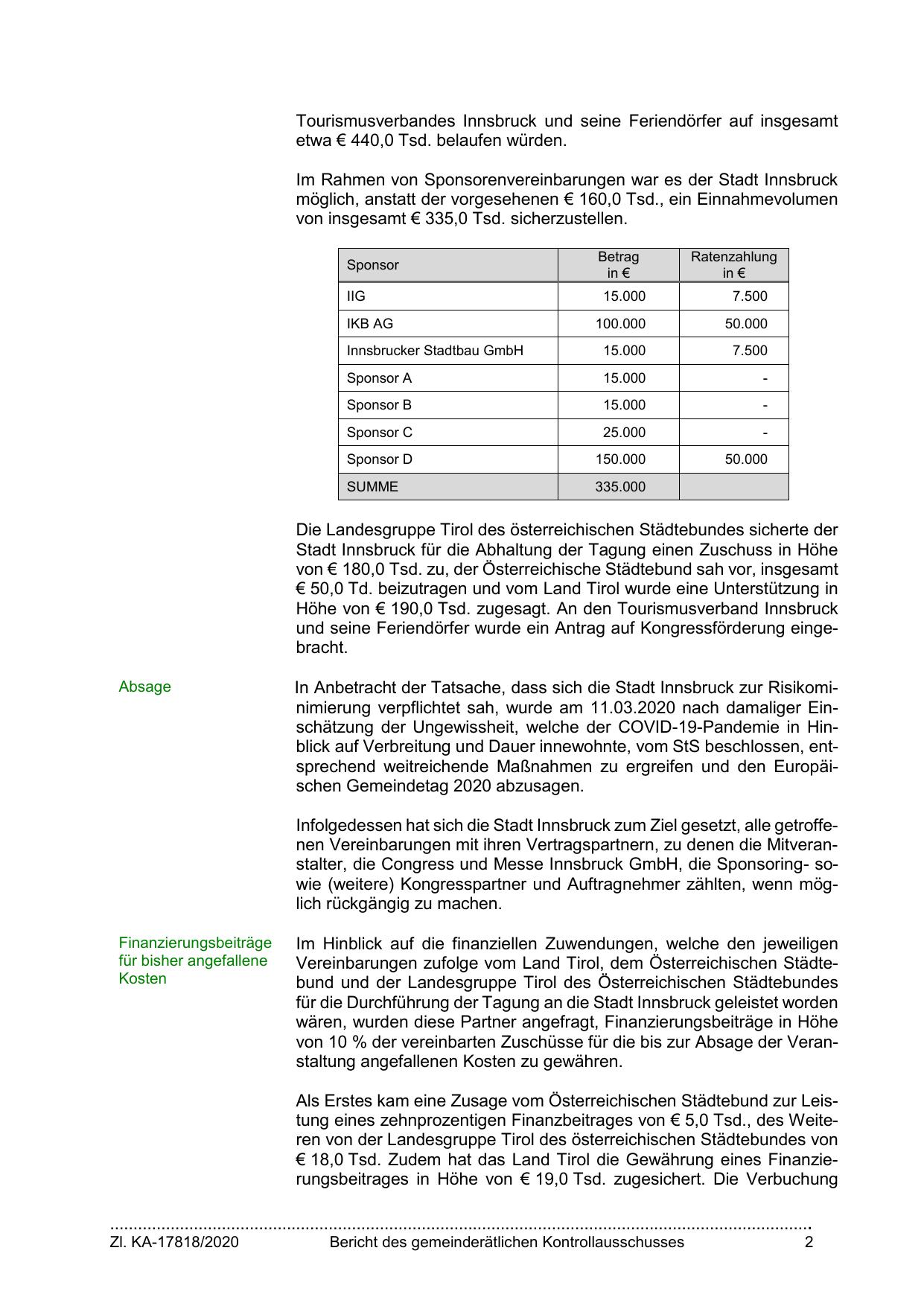 Als Erstes kam eine Zusage vom Österreichischen Städtebund zur Leistung eines zehnprozentigen Finanzbeitrages von € 5,0 Tsd., des Weiteren von der Landesgruppe Tirol des österreichischen Städtebundes von