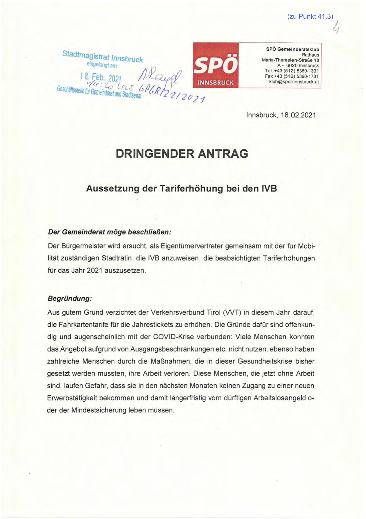 Der Bürgermeister wird ersucht, als Eigentümervertreter gemeinsam mit der für Mobilität zuständigen Stadträtin , die IVB anzuweisen , die beabsichtigten Tariferhöhungen