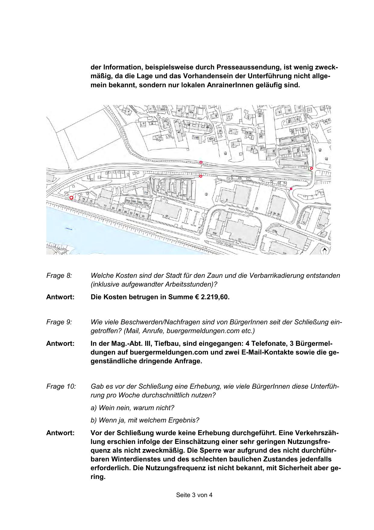 In der Mag.-Abt. III, Tiefbau, sind eingegangen: 4 Telefonate, 3 Bürgermeldungen auf buergermeldungen.com und zwei E-Mail-Kontakte sowie die gegenständliche dringende Anfrage.