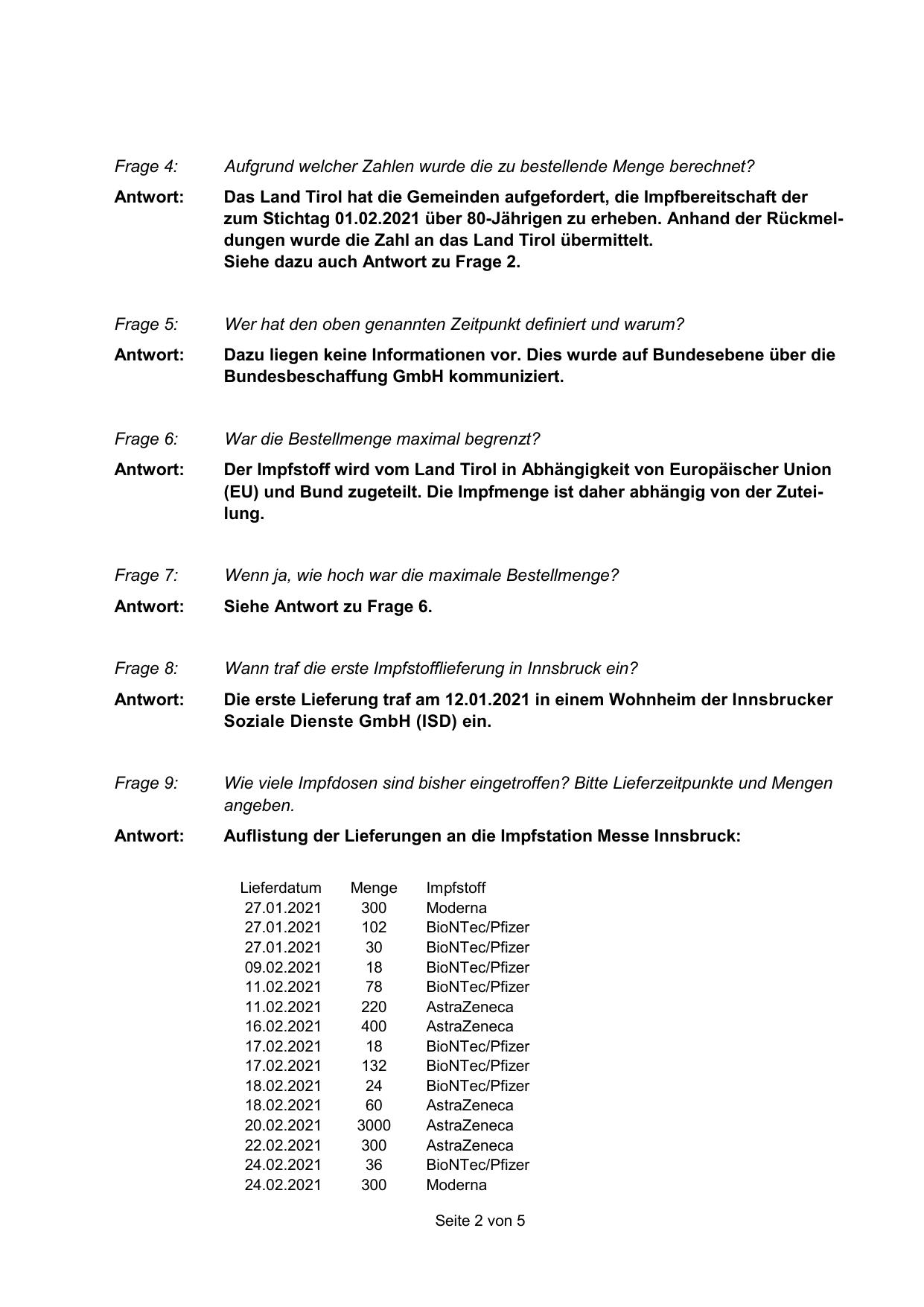 Auflistung der Lieferungen an die Impfstation Messe Innsbruck: