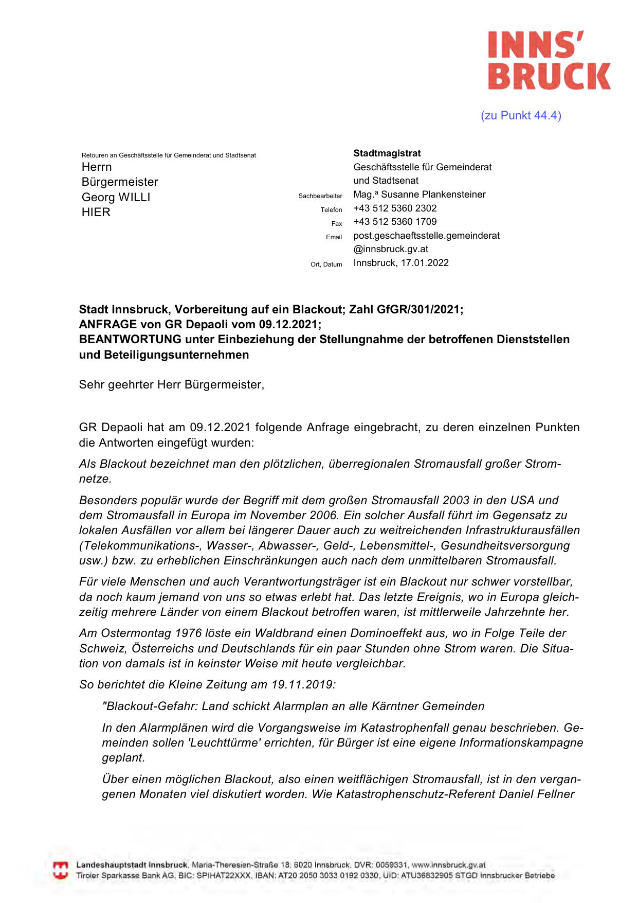 Stadt Innsbruck, Vorbereitung auf ein Blackout; Zahl GfGR/301/2021;