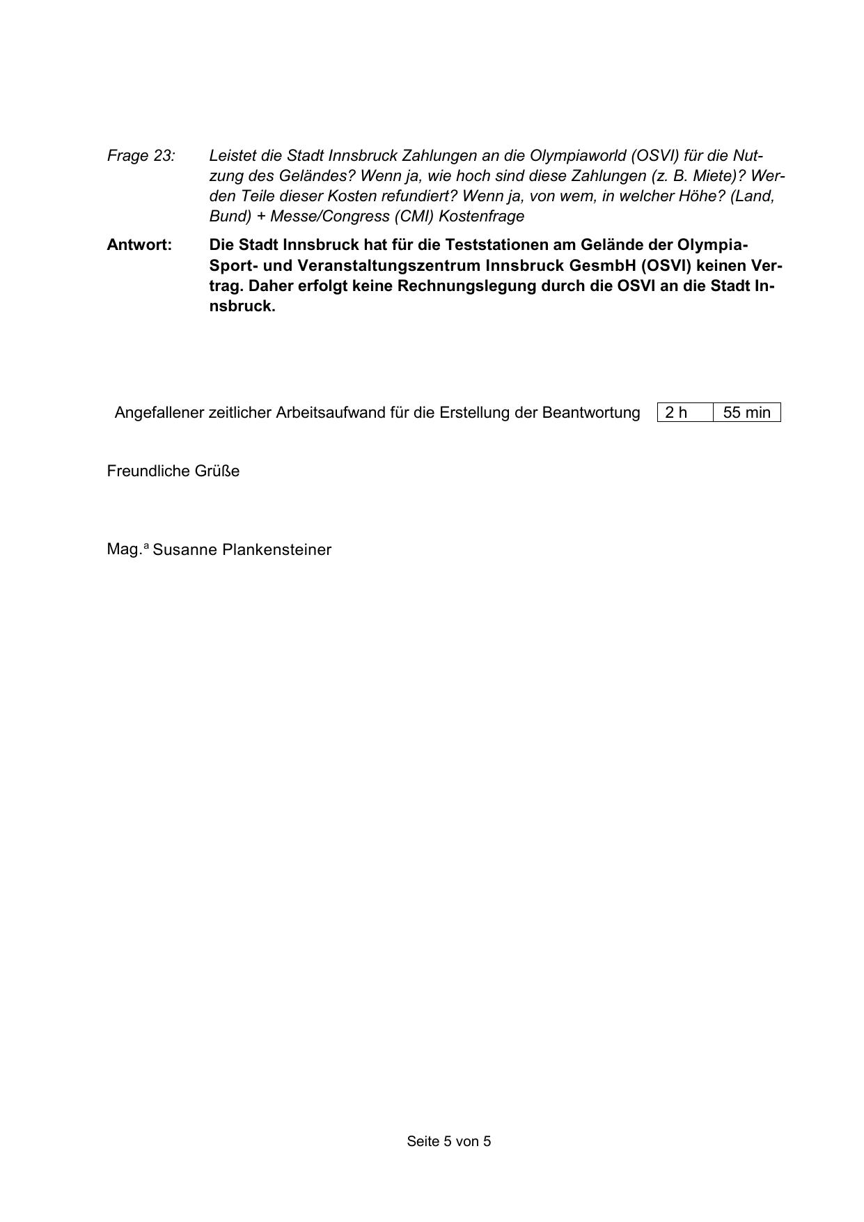 Leistet die Stadt Innsbruck Zahlungen an die Olympiaworld (OSVI) für die Nutzung des Geländes? Wenn ja, wie hoch sind diese Zahlungen (z. B. Miete)? Werden Teile dieser Kosten refundiert? Wenn ja, von wem, in welcher Höhe? (Land,