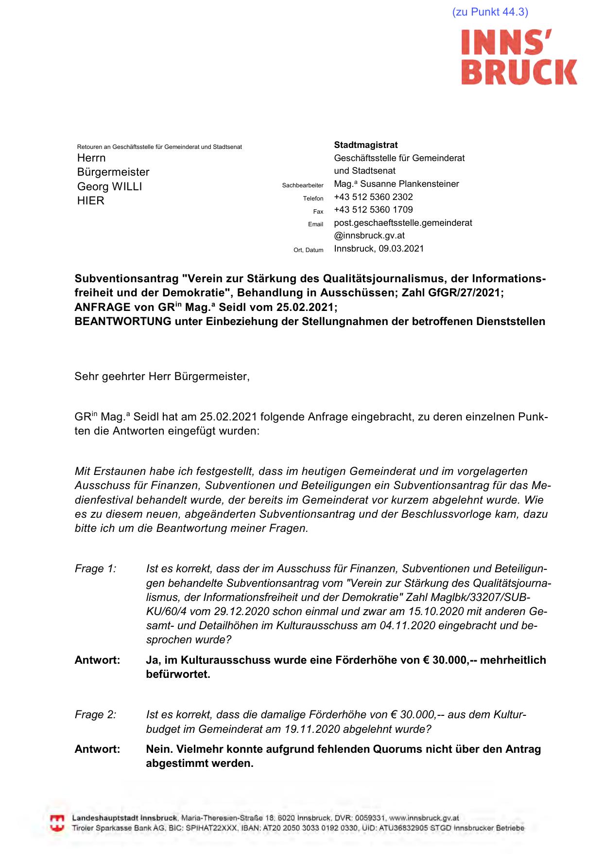 GRin Mag.a Seidl hat am 25.02.2021 folgende Anfrage eingebracht, zu deren einzelnen Punkten die Antworten eingefügt wurden:
