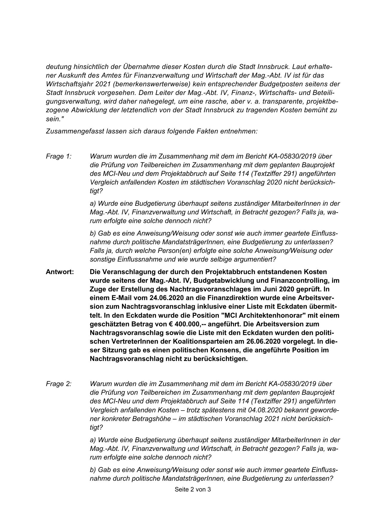 Stadt Innsbruck vorgesehen. Dem Leiter der Mag.-Abt. IV, Finanz-, Wirtschafts- und Beteiligungsverwaltung, wird daher nahegelegt, um eine rasche, aber v. a. transparente, projektbezogene Abwicklung der letztendlich von der Stadt Innsbruck zu tragenden Kosten bemüht zu