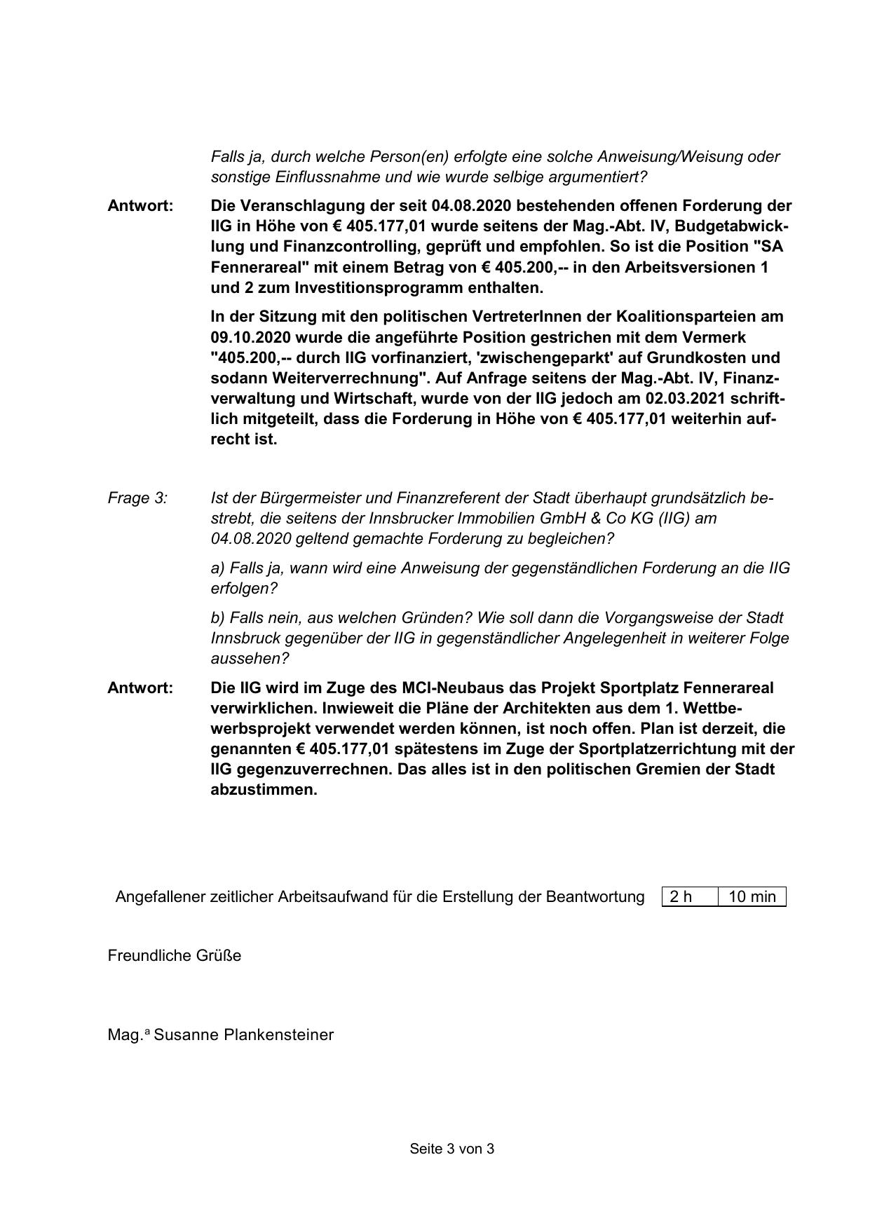 Ist der Bürgermeister und Finanzreferent der Stadt überhaupt grundsätzlich bestrebt, die seitens der Innsbrucker Immobilien GmbH & Co KG (IIG) am