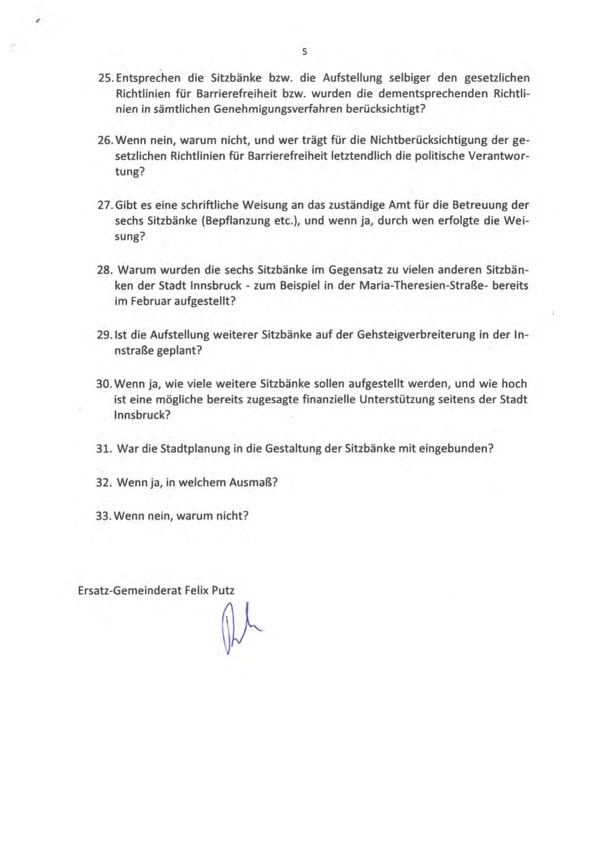 28. Warum wurden die sechs Sitzbänke im Gegensatz zu vielen anderen Sitzbänken der Stadt Innsbruck - zum Beispiel in der Maria-Theresien-Straße- bereits