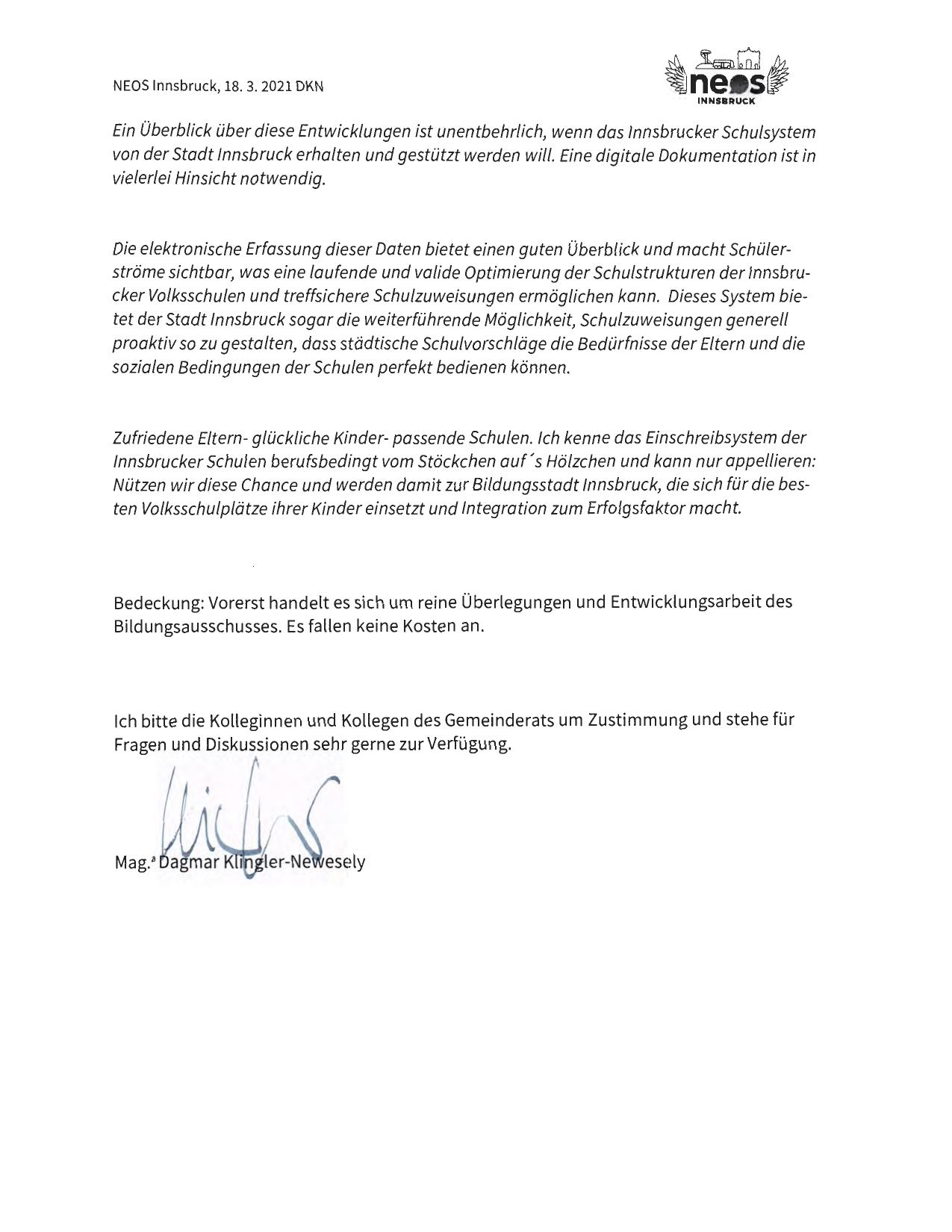 Die elektronische Erfassung dieser Daten bietet einen guten Überblick und macht Schülerströme sichtbar, was eine laufende und valide Optimierung der Schulstrukturen der lnnsbrucker Volksschulen und treffsichere Schulzuweisungen ermöglichen kann. Dieses System bietet der Stadt Innsbruck sogar die weiterführende Möglichkeit, Schulzuweisungen generell