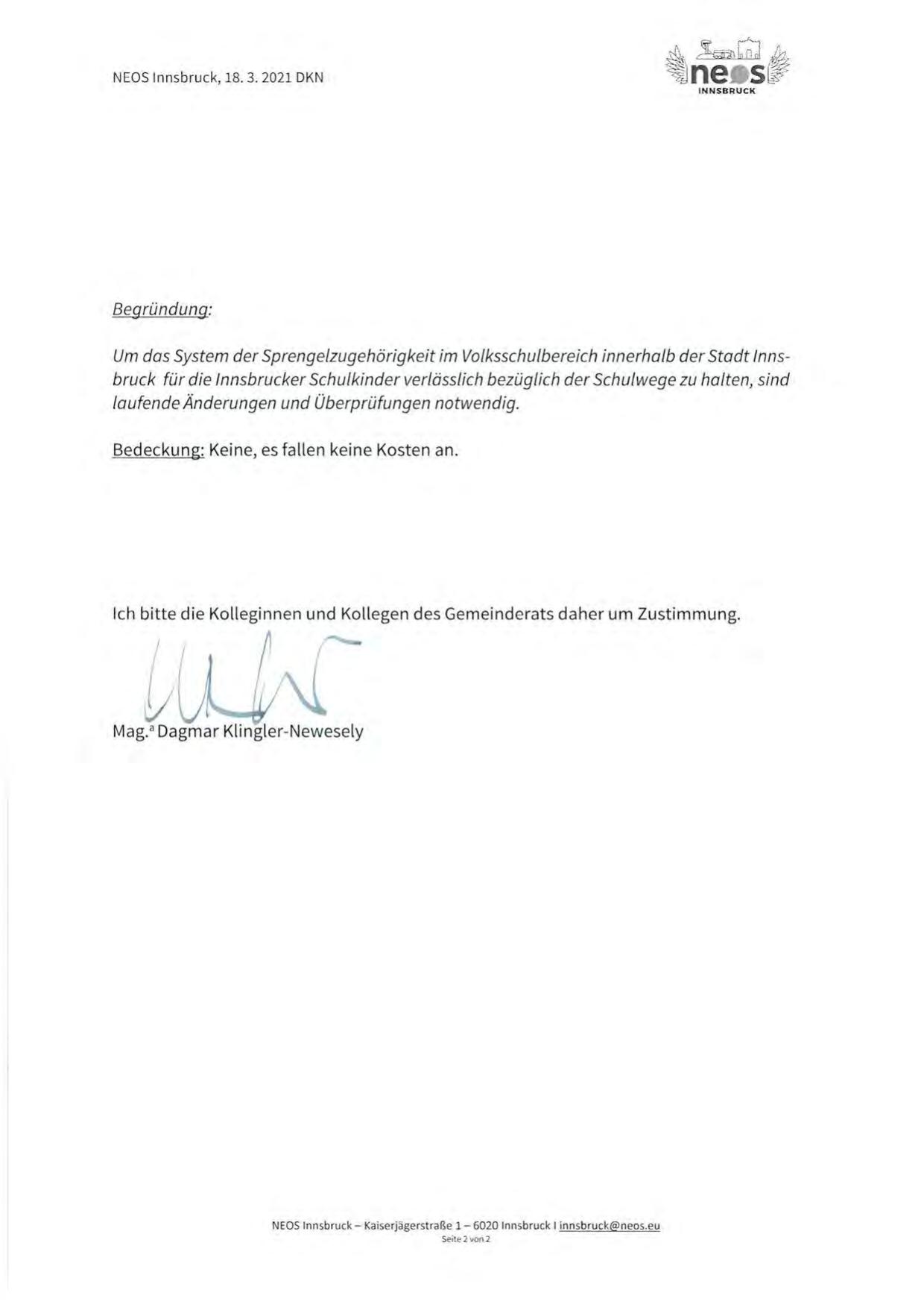 Um das System der Sprengelzugehörigkeit im Volksschulbereich innerhalb der Stadt Innsbruck für die lnnsbrucker Schulkinder verlässlich bezüglich der Schulwege zu halten, sind