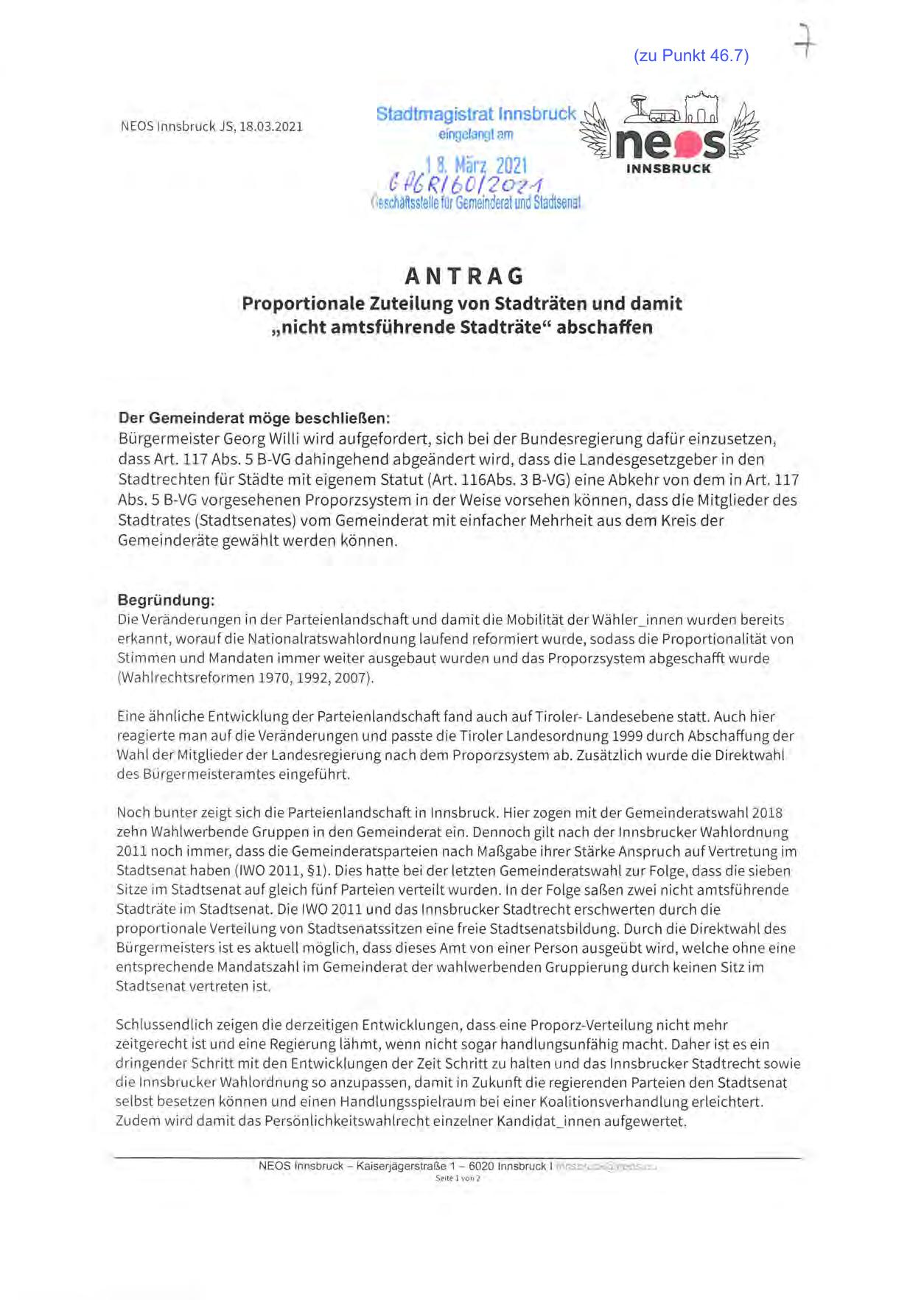 die lnnsbrucker Wahlordnung so anzupassen, damit in Zukunft die regierenden Parteien den Stadtsenat