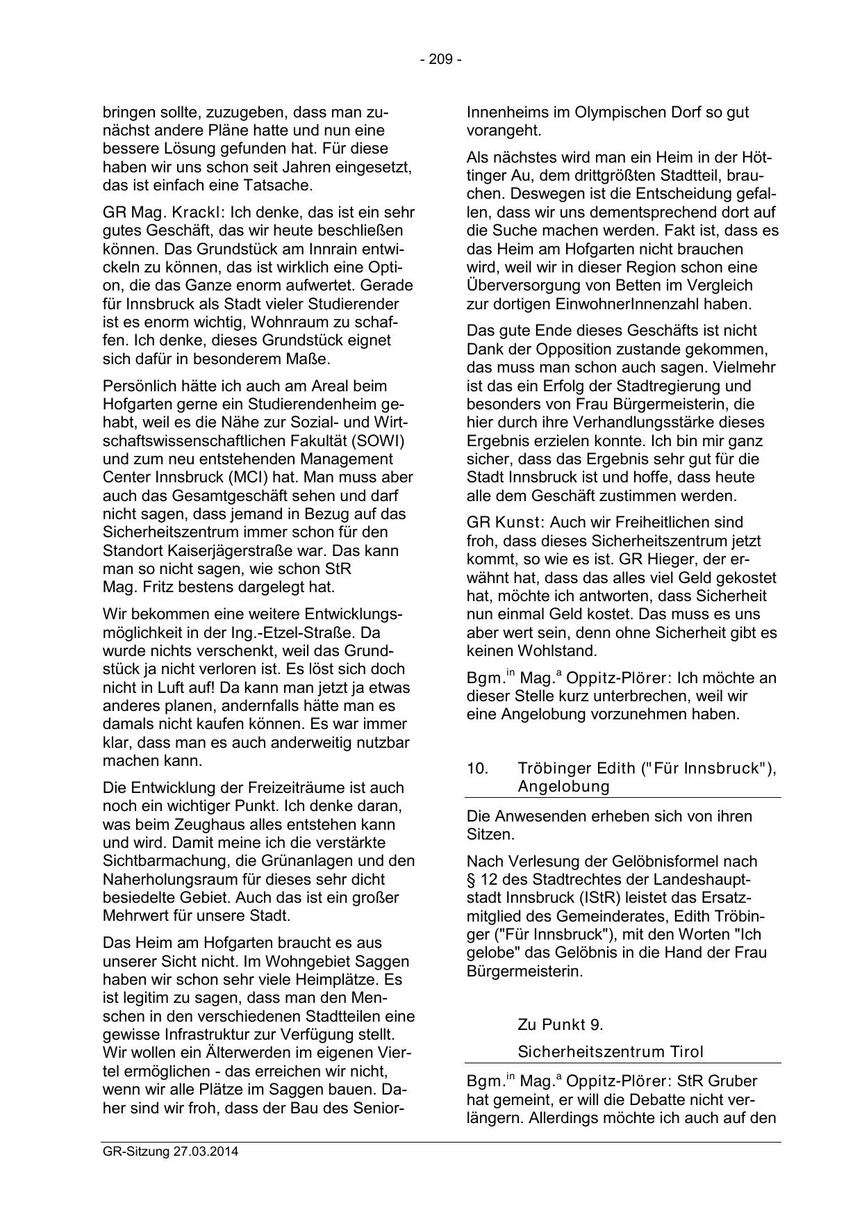 § 12 des Stadtrechtes der Landeshauptstadt Innsbruck (IStR) leistet das Ersatzmitglied des Gemeinderates, Edith Tröbinger ("Für Innsbruck"), mit den Worten "Ich