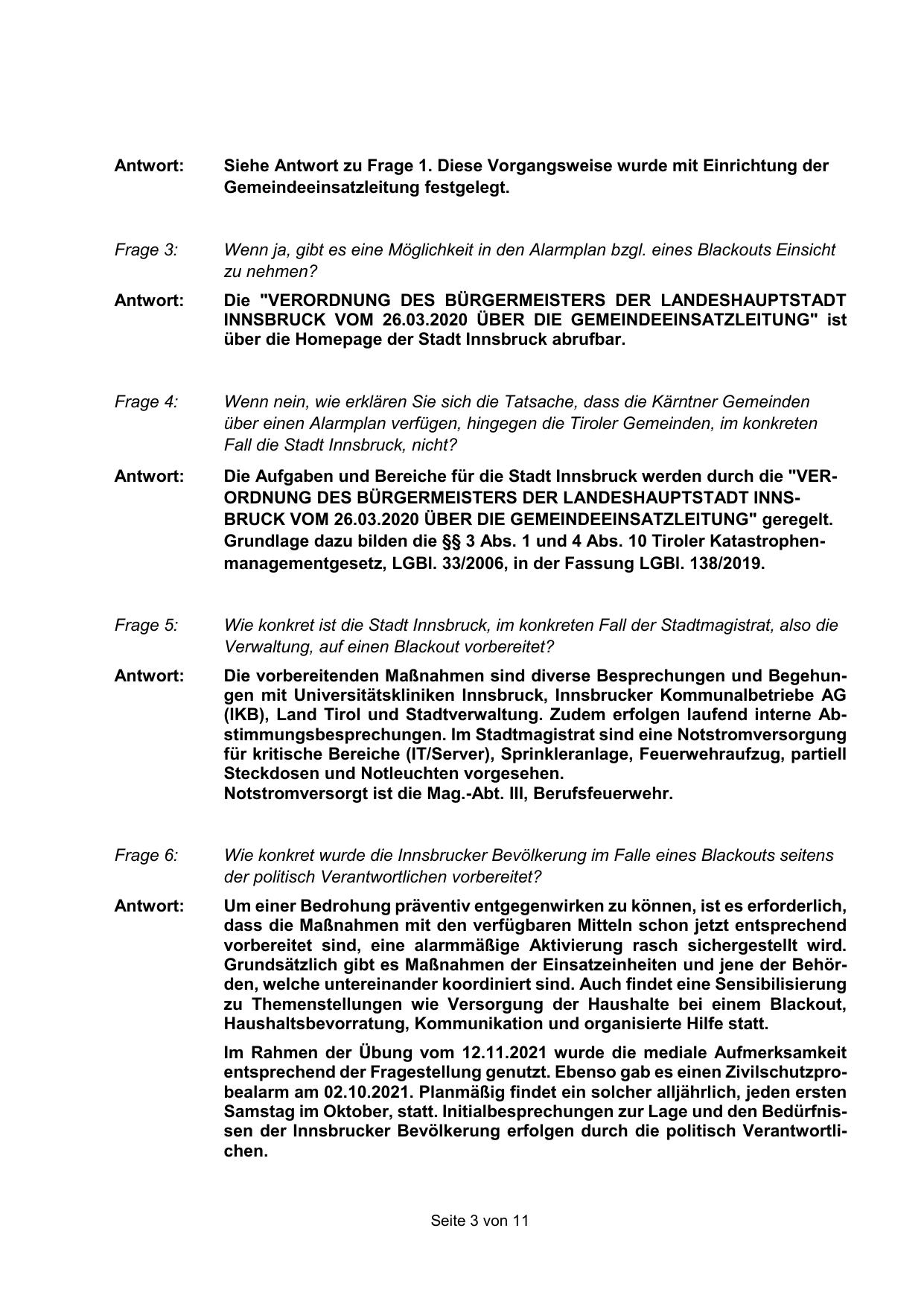 (IKB), Land Tirol und Stadtverwaltung. Zudem erfolgen laufend interne Abstimmungsbesprechungen. Im Stadtmagistrat sind eine Notstromversorgung