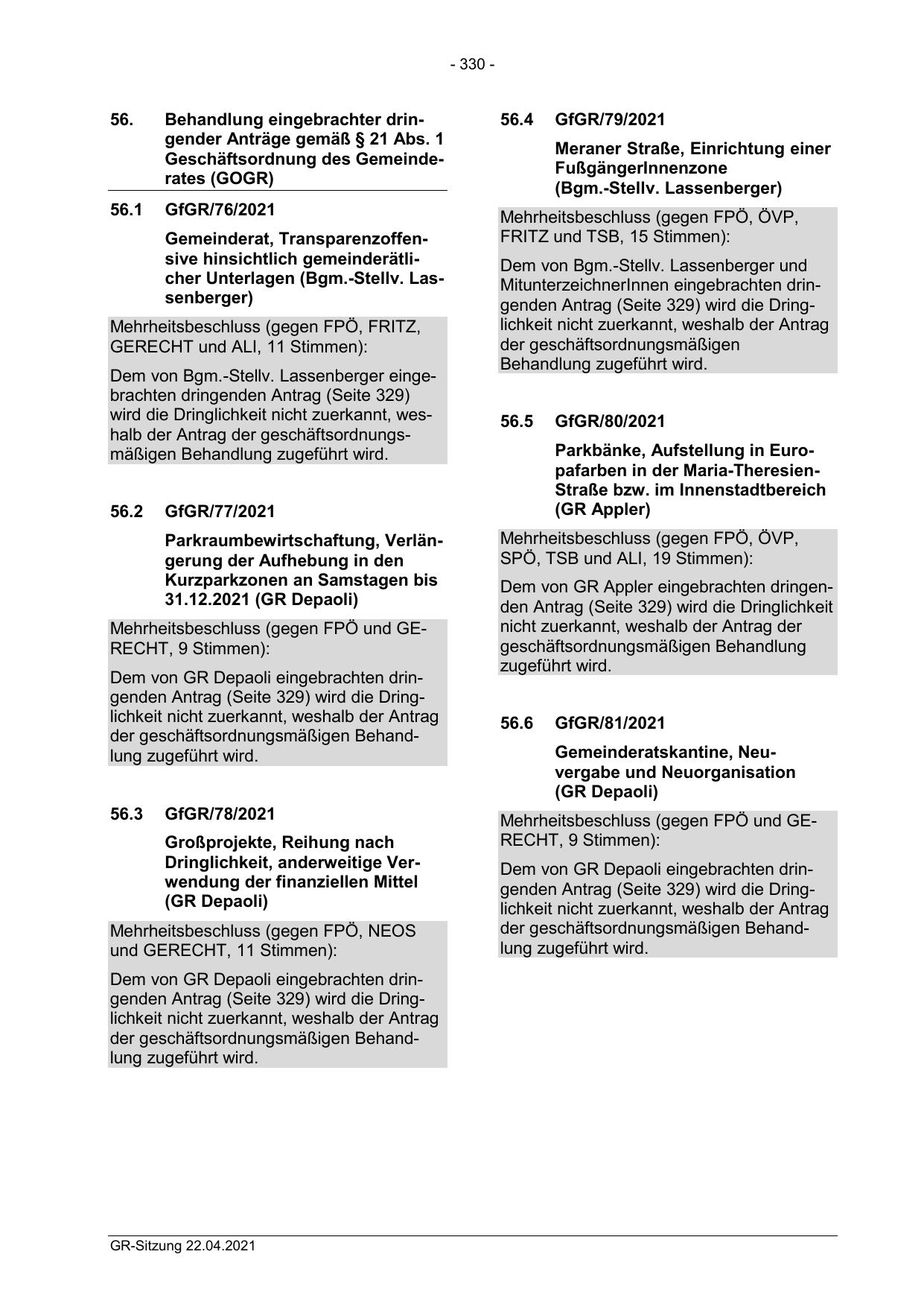 Dem von GR Depaoli eingebrachten dringenden Antrag (Seite 329) wird die Dringlichkeit nicht zuerkannt, weshalb der Antrag