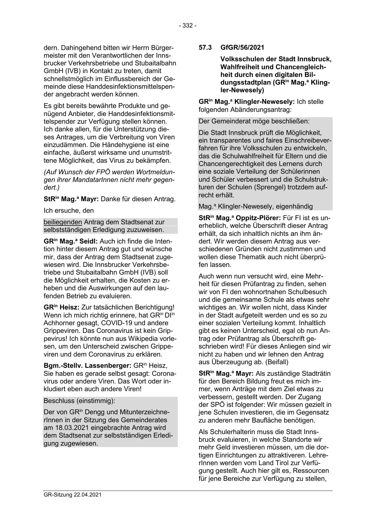 Der von GRin Dengg und MitunterzeichnerInnen in der Sitzung des Gemeinderates