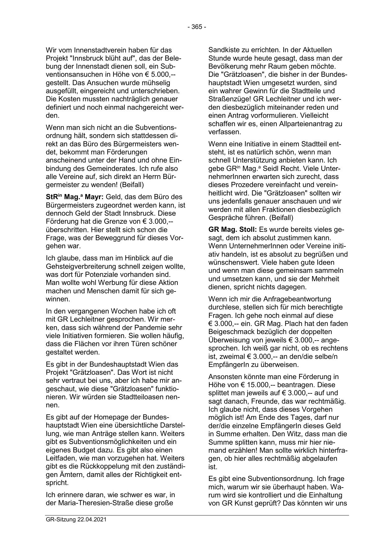 Projekt "Innsbruck blüht auf", das der Belebung der Innenstadt dienen soll, ein Subventionsansuchen in Höhe von € 5.000,-gestellt. Das Ansuchen wurde mühselig