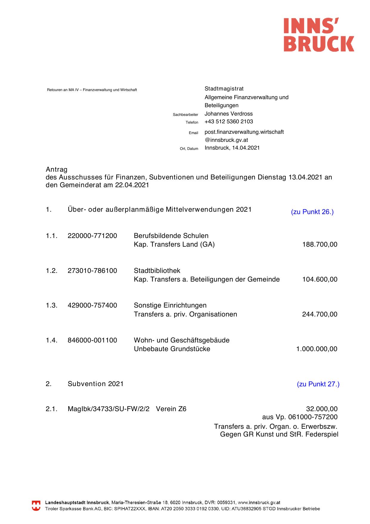 des Ausschusses für Finanzen, Subventionen und Beteiligungen Dienstag 13.04.2021 an