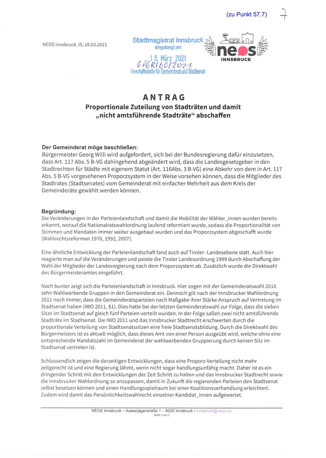 die lnnsbrucker Wahlordnung so anzupassen, damit in Zukunft die regierenden Parteien den Stadtsenat
