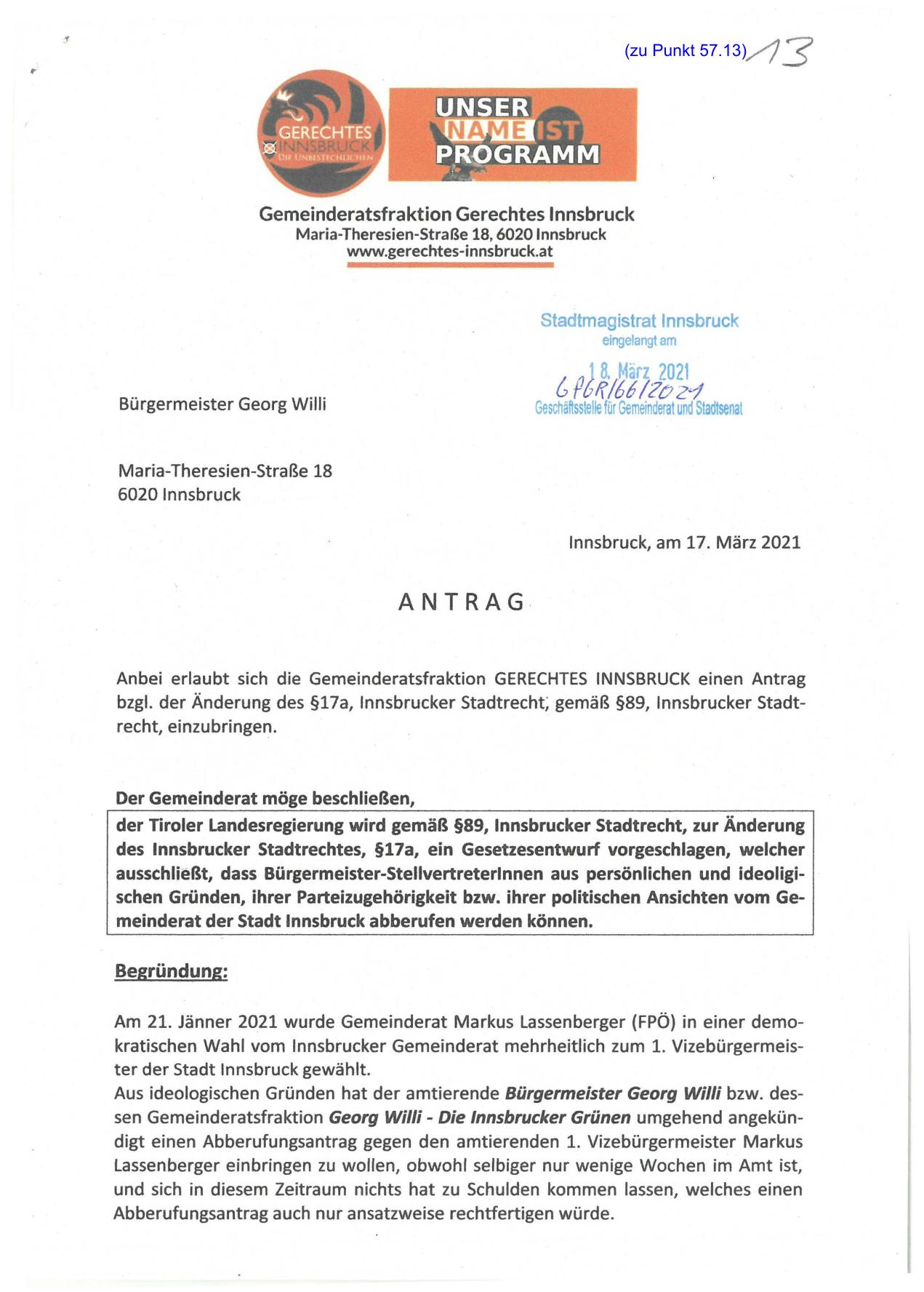 Anbei erlaubt sich die Gemeinderatsfraktion GERECHTES INNSBRUCK einen Antrag
