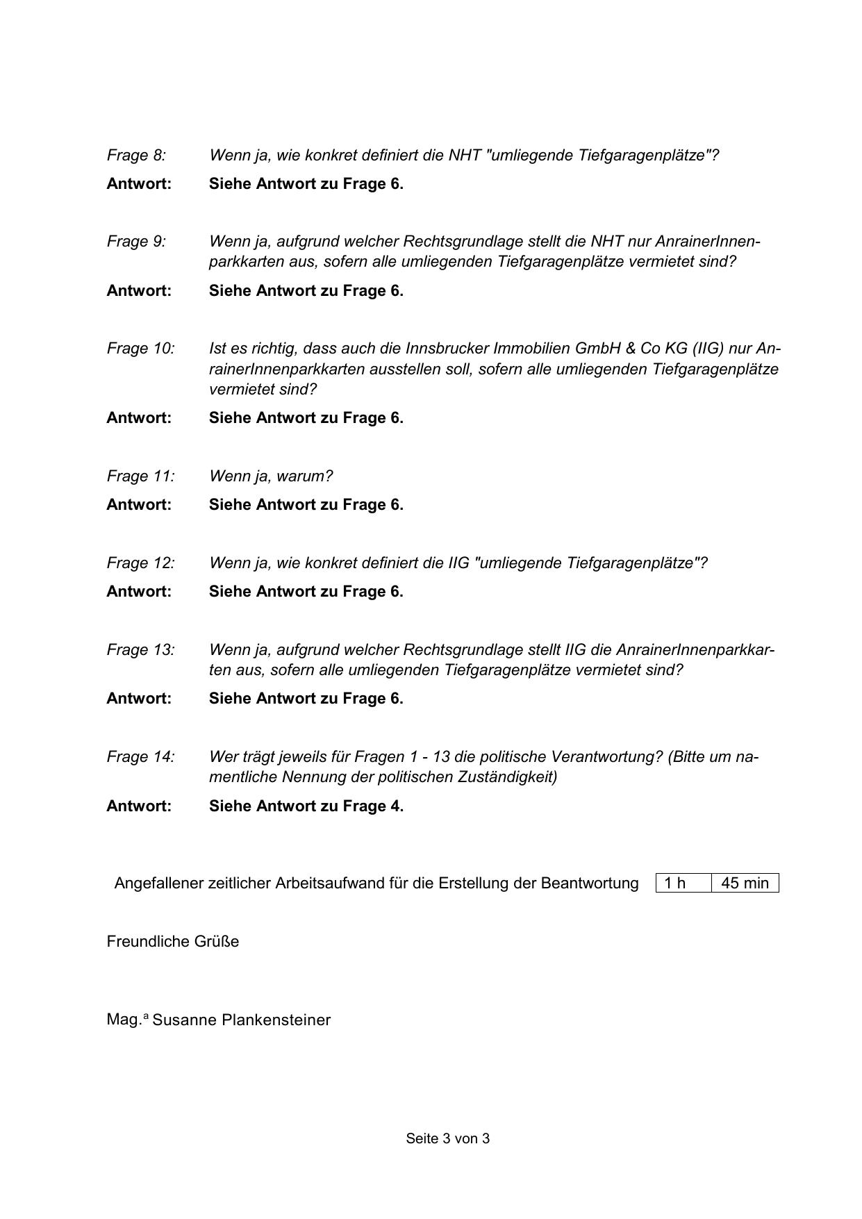 Ist es richtig, dass auch die Innsbrucker Immobilien GmbH & Co KG (IIG) nur AnrainerInnenparkkarten ausstellen soll, sofern alle umliegenden Tiefgaragenplätze