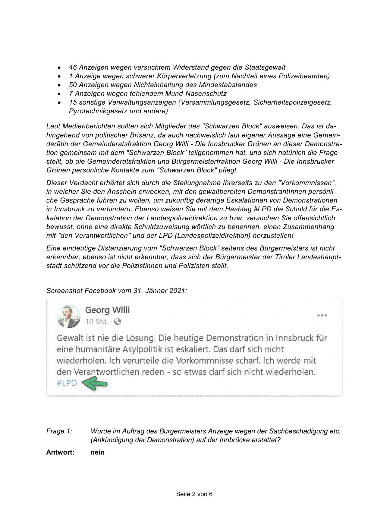 Laut Medienberichten sollten sich Mitglieder des "Schwarzen Block" ausweisen. Das ist dahingehend von politischer Brisanz, da auch nachweislich laut eigener Aussage eine Gemeinderätin der Gemeinderatsfraktion Georg Willi - Die Innsbrucker Grünen an dieser Demonstration gemeinsam mit dem "Schwarzen Block" teilgenommen hat, und sich natürlich die Frage