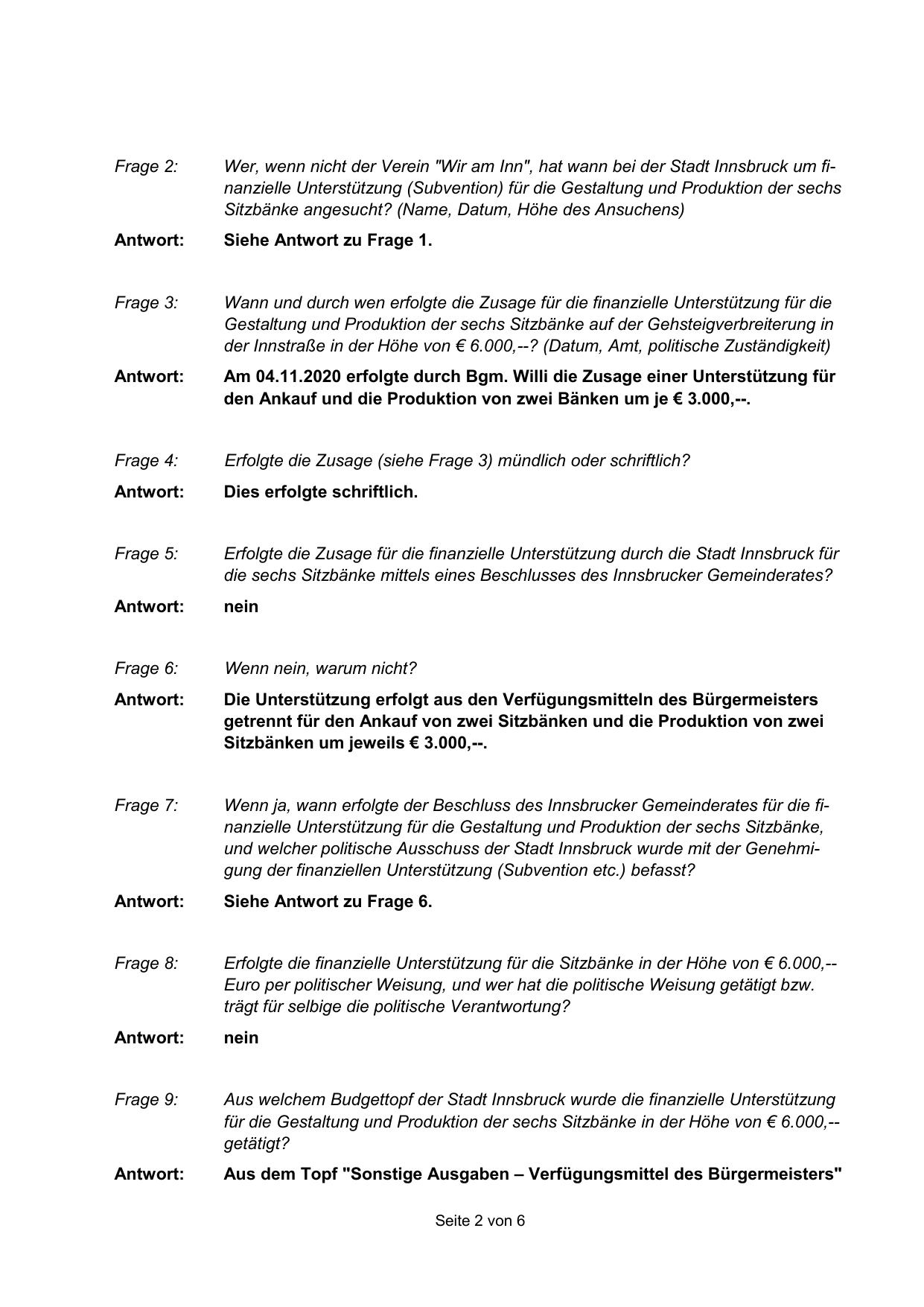 Wenn ja, wann erfolgte der Beschluss des Innsbrucker Gemeinderates für die finanzielle Unterstützung für die Gestaltung und Produktion der sechs Sitzbänke,