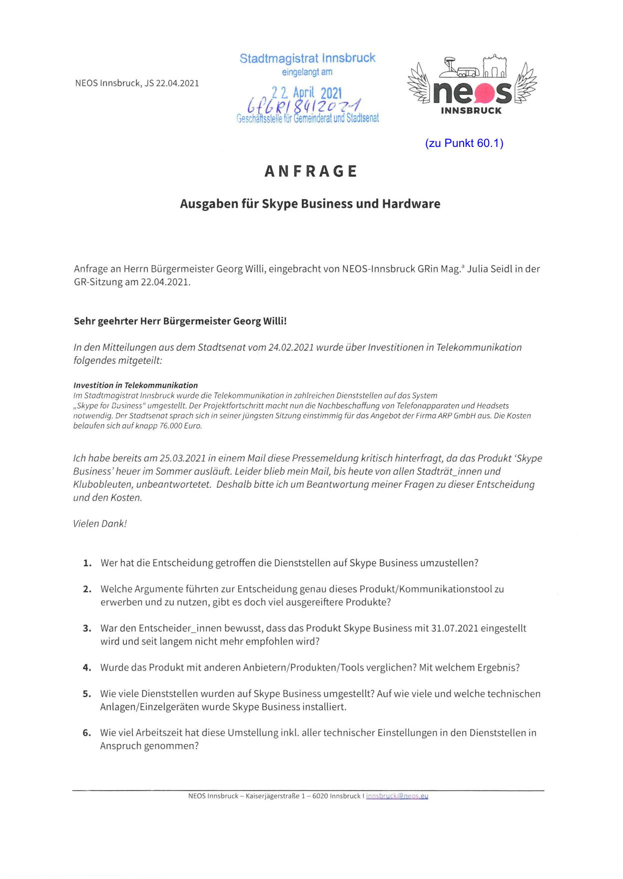 Anfrage an Herrn Bürgermeister Georg Willi, eingebracht von NEOS-lnnsbruck GRin Mag." Julia Seidl in der