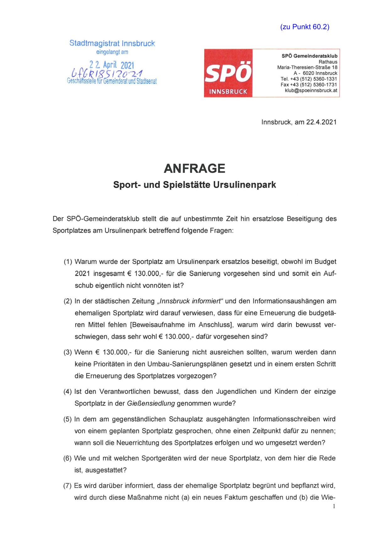 Sportplatzes am Ursulinenpark betreffend folgende Fragen :