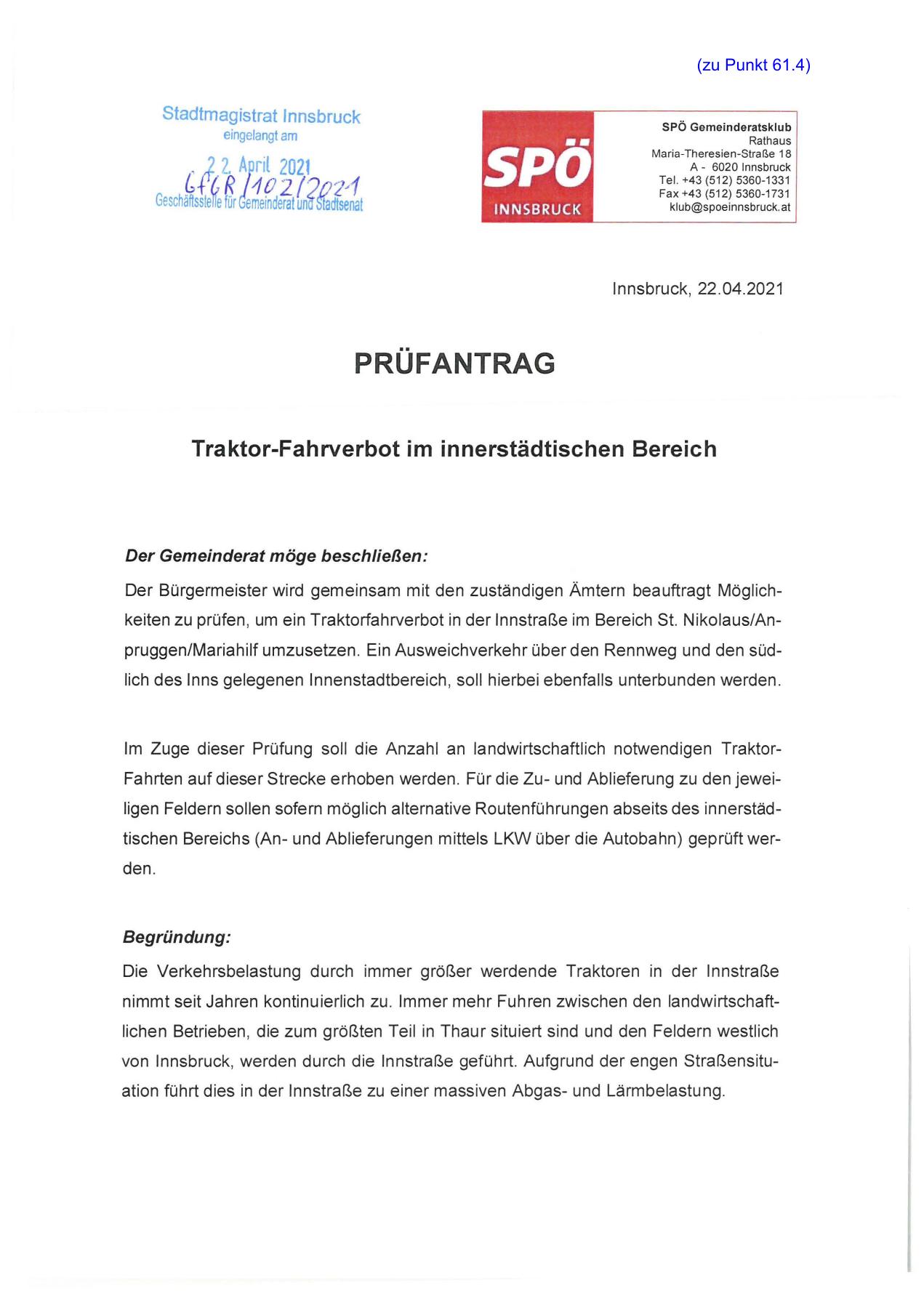 Der Bürgermeister wird gemeinsam mit den zuständigen Ämtern beauftragt Möglichkeiten zu prüfen , um ein Traktorfahrverbot in der lnnstraße im Bereich St. Nikolaus/Anpruggen/Mariahilf umzusetzen. Ein Ausweichverkehr über den Rennweg und den südlich des lnns gelegenen Innenstadtbereich, soll hierbei ebenfalls unterbunden werden .