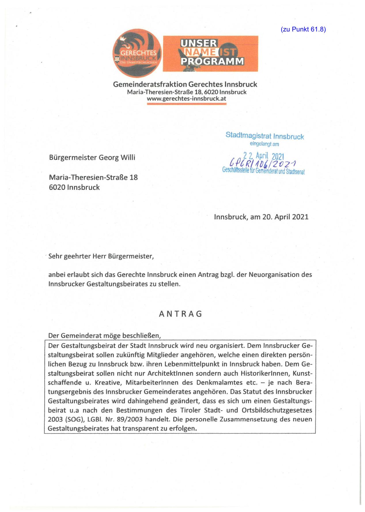 anbei erlaubt sich das Gerechte Innsbruck einen Antrag bzgl. der Neuorganisation des