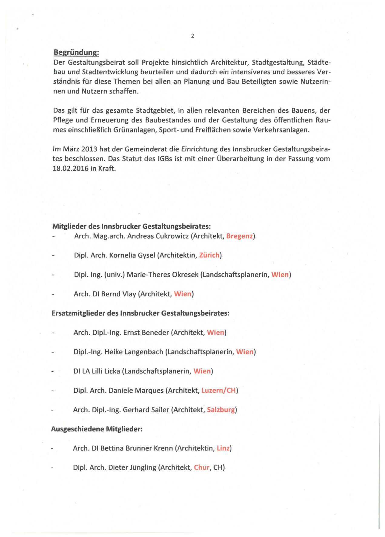 Im März 2013 hat der Gemeinderat die Einrichtung des lnnsbrucker Gestaltungsbeirates beschlossen. Das Statut des IGBs ist mit einer Überarbeitung in der Fassung vom