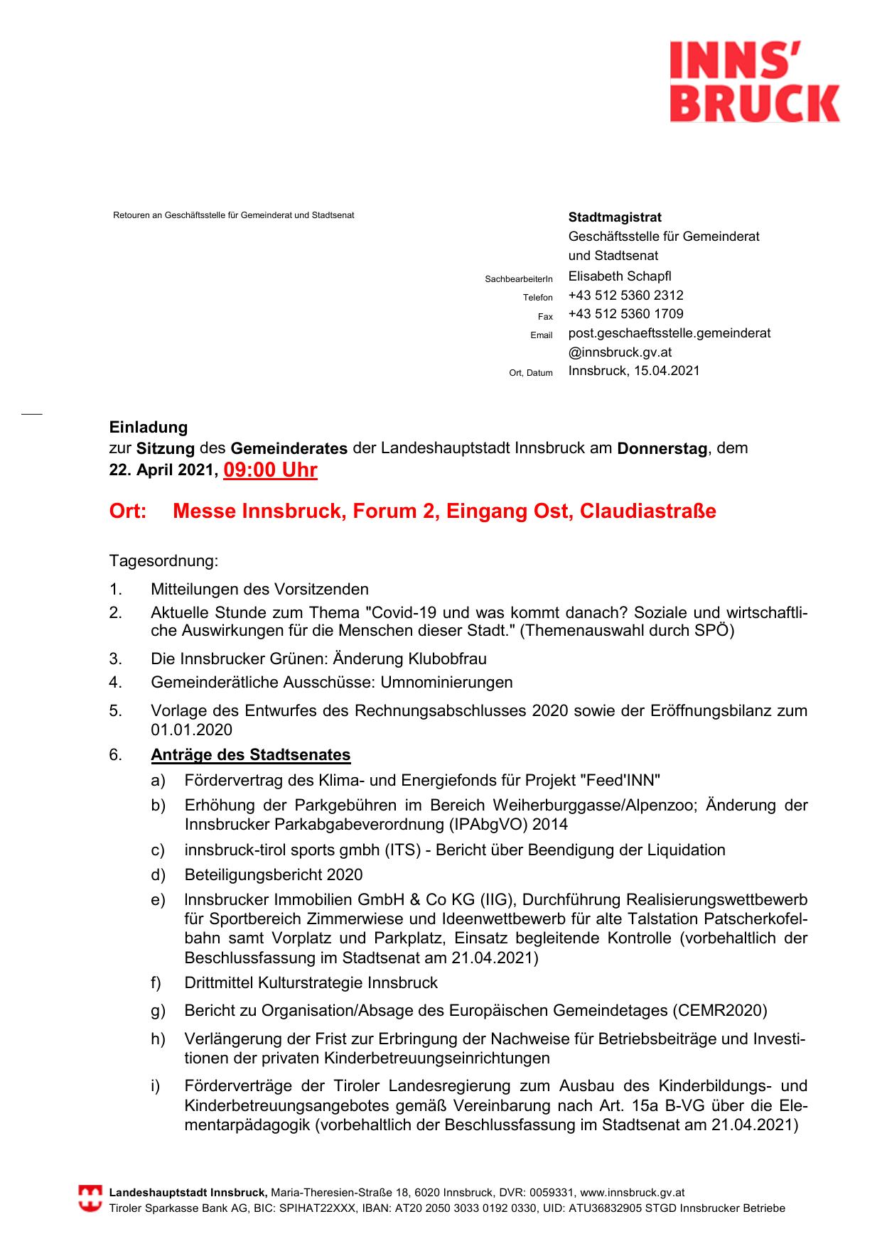 zur Sitzung des Gemeinderates der Landeshauptstadt Innsbruck am Donnerstag, dem