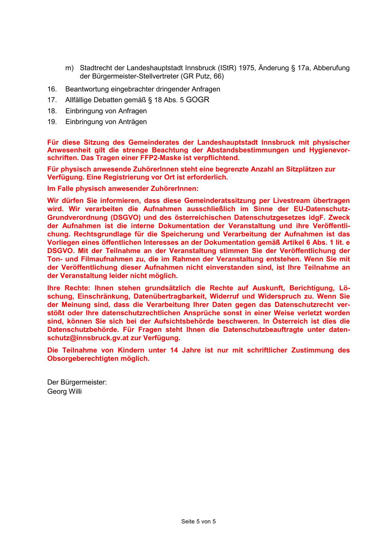 Für diese Sitzung des Gemeinderates der Landeshauptstadt Innsbruck mit physischer