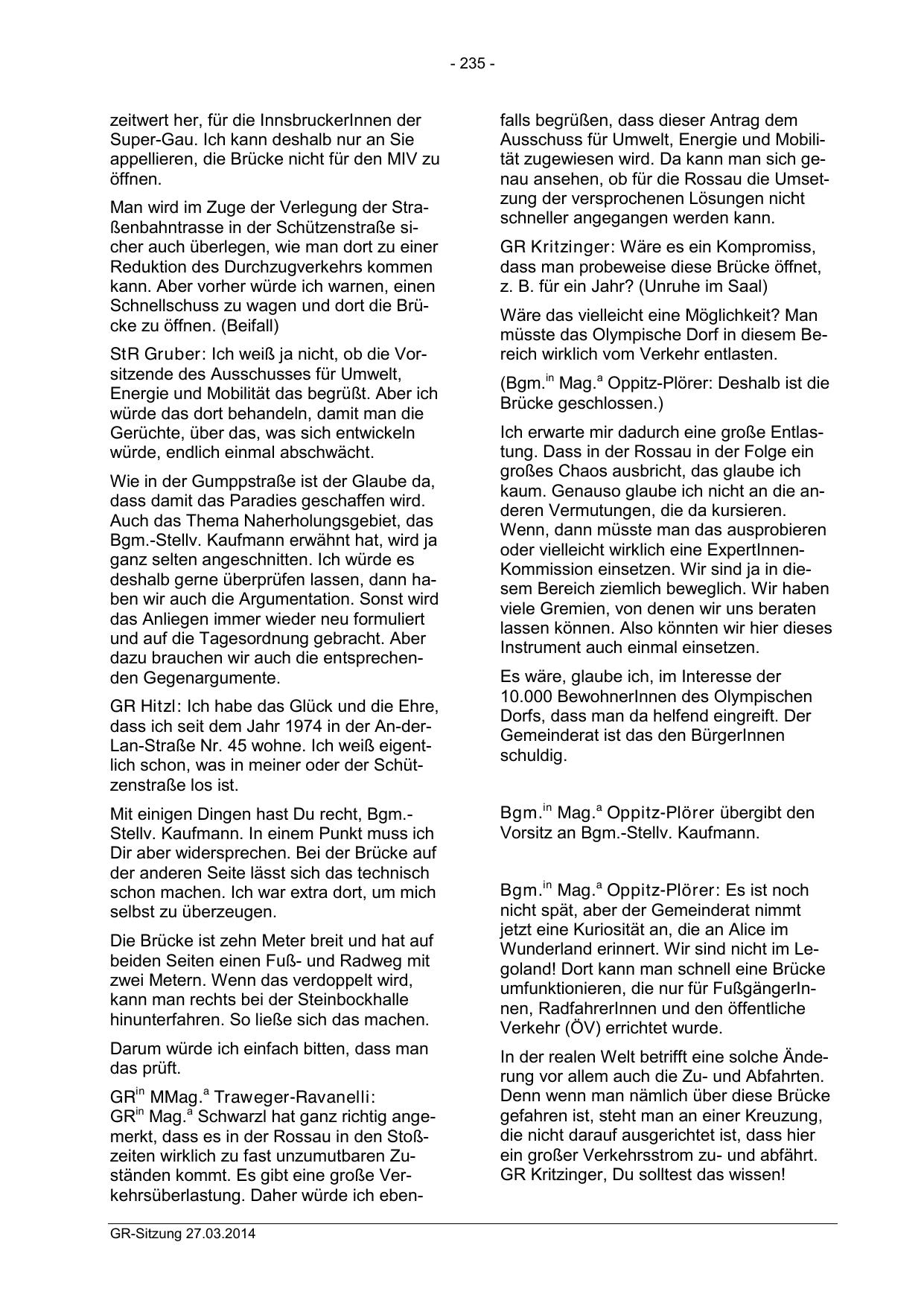 GRin Mag.a Schwarzl hat ganz richtig angemerkt, dass es in der Rossau in den Stoßzeiten wirklich zu fast unzumutbaren Zuständen kommt. Es gibt eine große Verkehrsüberlastung. Daher würde ich ebenGR-Sitzung 27.03.2014