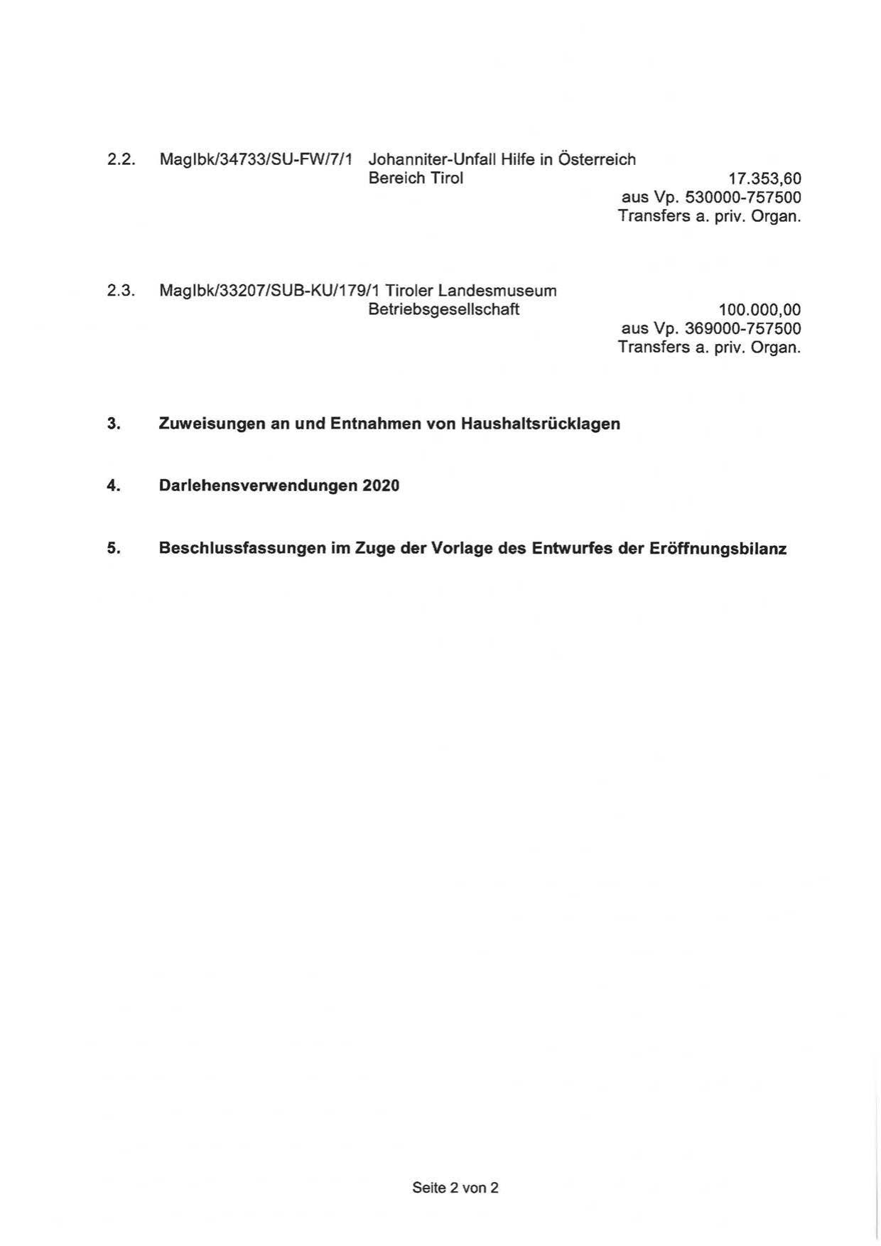 Beschlussfassungen im Zuge der Vorlage des Entwurfes der Eröffnungsbilanz