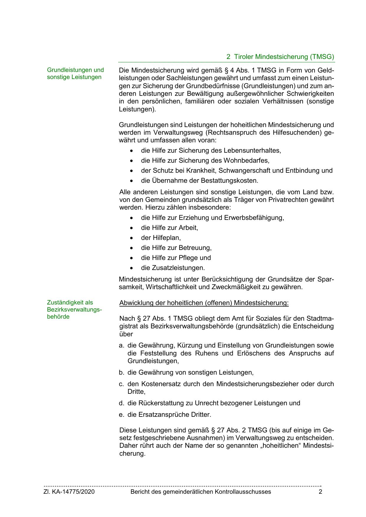 Die Mindestsicherung wird gemäß § 4 Abs. 1 TMSG in Form von Geldleistungen oder Sachleistungen gewährt und umfasst zum einen Leistungen zur Sicherung der Grundbedürfnisse (Grundleistungen) und zum anderen Leistungen zur Bewältigung außergewöhnlicher Schwierigkeiten