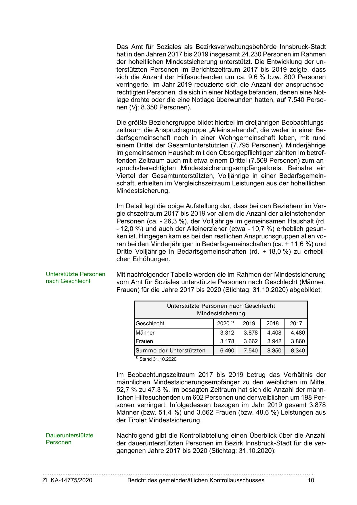 der dauerunterstützten Personen im Bezirk Innsbruck-Stadt für die vergangenen Jahre 2017 bis 2020 (Stichtag: 31.10.2020):