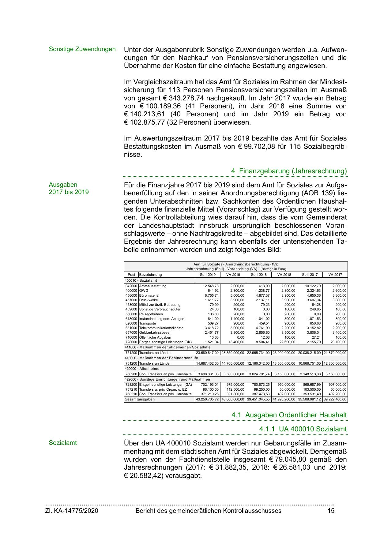 Für die Finanzjahre 2017 bis 2019 sind dem Amt für Soziales zur Aufgabenerfüllung auf den in seiner Anordnungsberechtigung (AOB 139) liegenden Unterabschnitten bzw. Sachkonten des Ordentlichen Haushaltes folgende finanzielle Mittel (Voranschlag) zur Verfügung gestellt worden. Die Kontrollabteilung wies darauf hin, dass die vom Gemeinderat