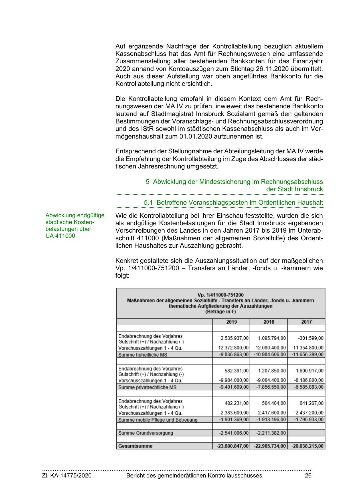 Vorschreibungen des Landes in den Jahren 2017 bis 2019 im Unterabschnitt 411000 (Maßnahmen der allgemeinen Sozialhilfe) des Ordentlichen Haushaltes zur Auszahlung gebracht.