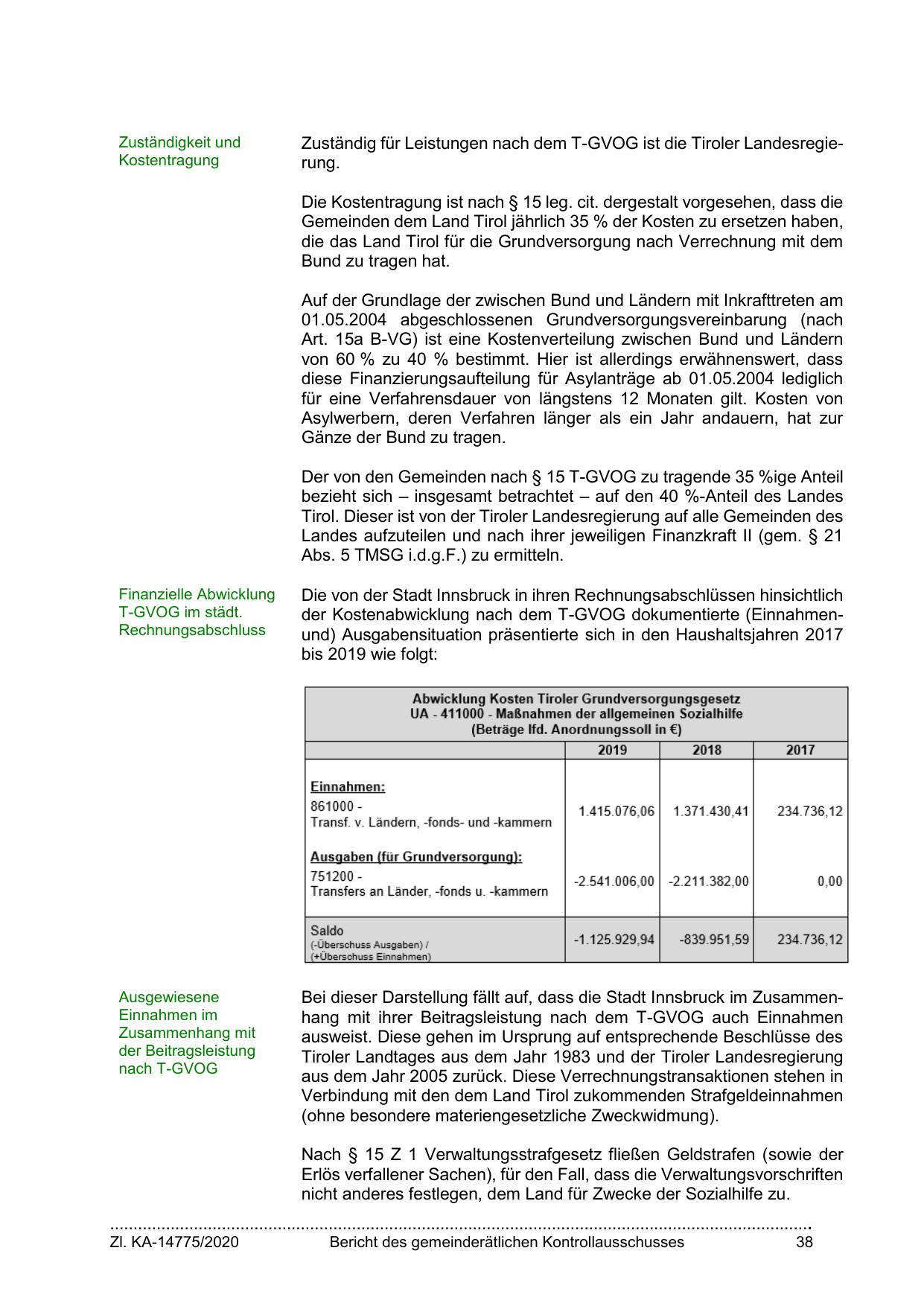 Bei dieser Darstellung fällt auf, dass die Stadt Innsbruck im Zusammenhang mit ihrer Beitragsleistung nach dem T-GVOG auch Einnahmen