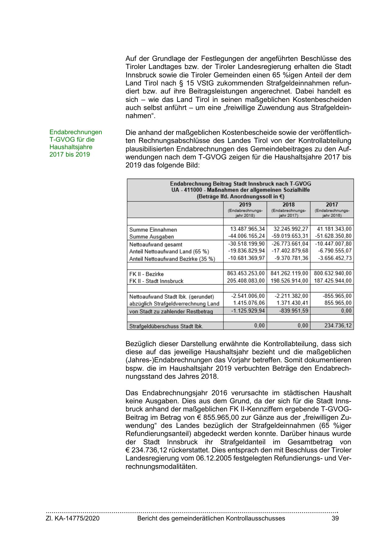 Endabrechnung Beitrag Stadt Innsbruck nach T-GVOG