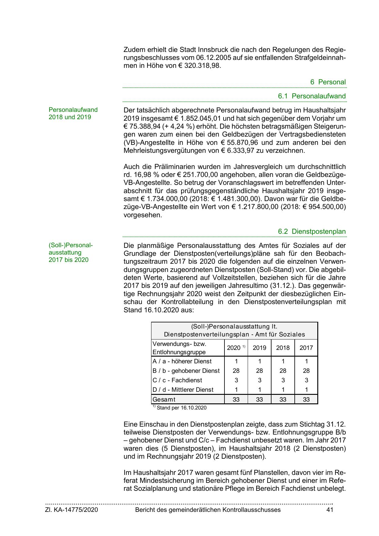 2017 bis 2019 auf den jeweiligen Jahresultimo (31.12.). Das gegenwärtige Rechnungsjahr 2020 weist den Zeitpunkt der diesbezüglichen Einschau der Kontrollabteilung in den Dienstpostenverteilungsplan mit