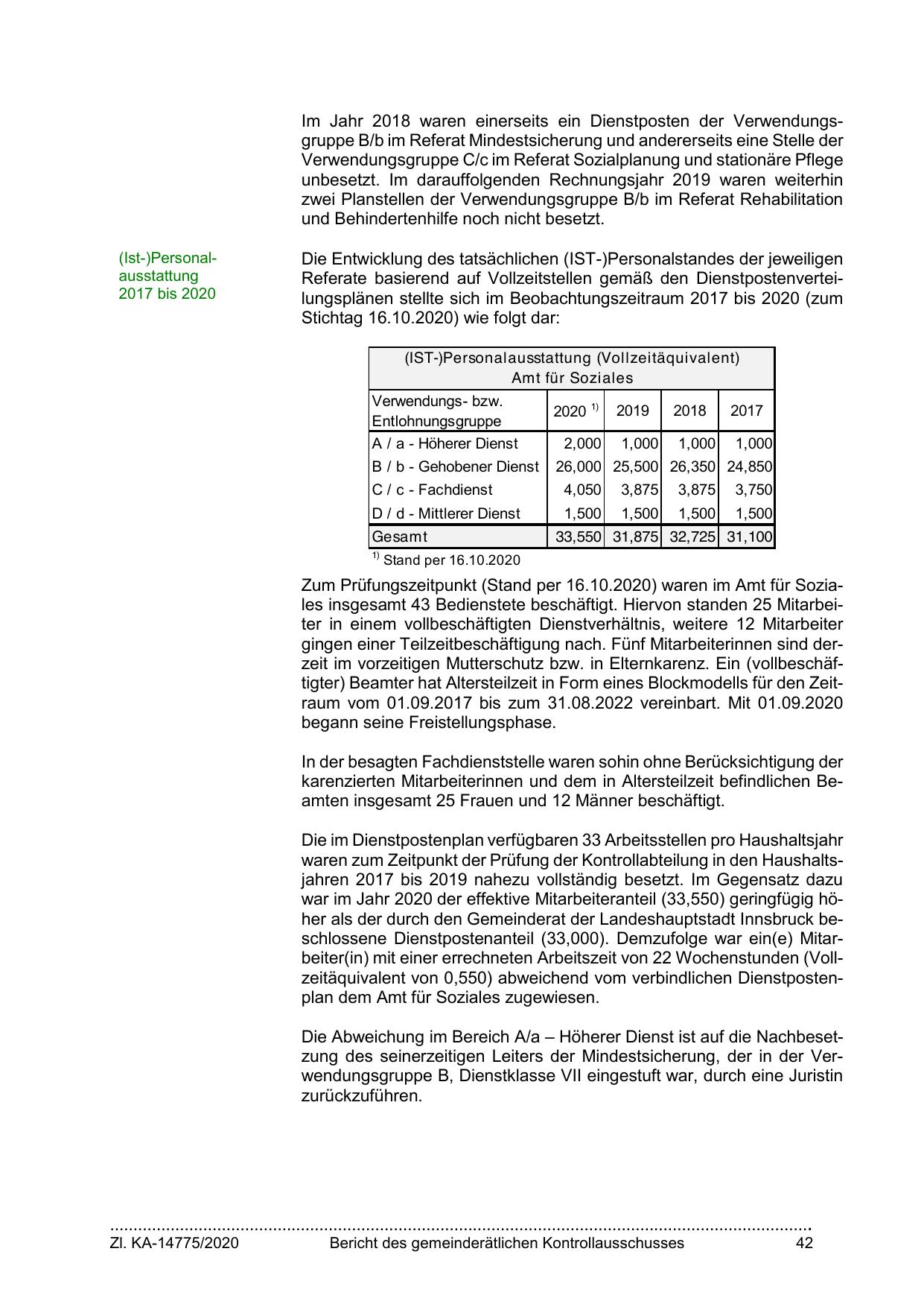 war im Jahr 2020 der effektive Mitarbeiteranteil (33,550) geringfügig höher als der durch den Gemeinderat der Landeshauptstadt Innsbruck beschlossene Dienstpostenanteil (33,000). Demzufolge war ein(e) Mitarbeiter(in) mit einer errechneten Arbeitszeit von 22 Wochenstunden (Vollzeitäquivalent von 0,550) abweichend vom verbindlichen Dienstpostenplan dem Amt für Soziales zugewiesen.