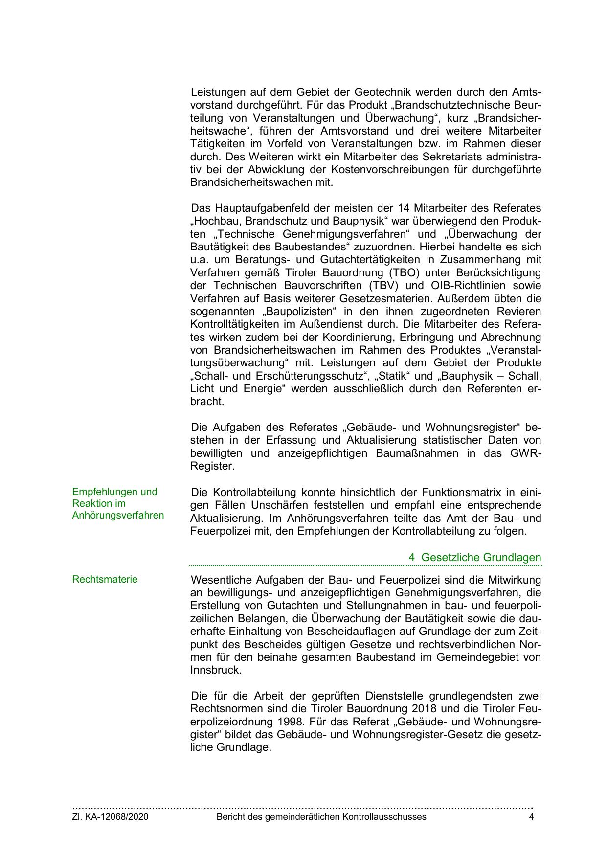 Rechtsnormen sind die Tiroler Bauordnung 2018 und die Tiroler Feuerpolizeiordnung 1998. Für das Referat „Gebäude- und Wohnungsregister“ bildet das Gebäude- und Wohnungsregister-Gesetz die gesetzliche Grundlage.