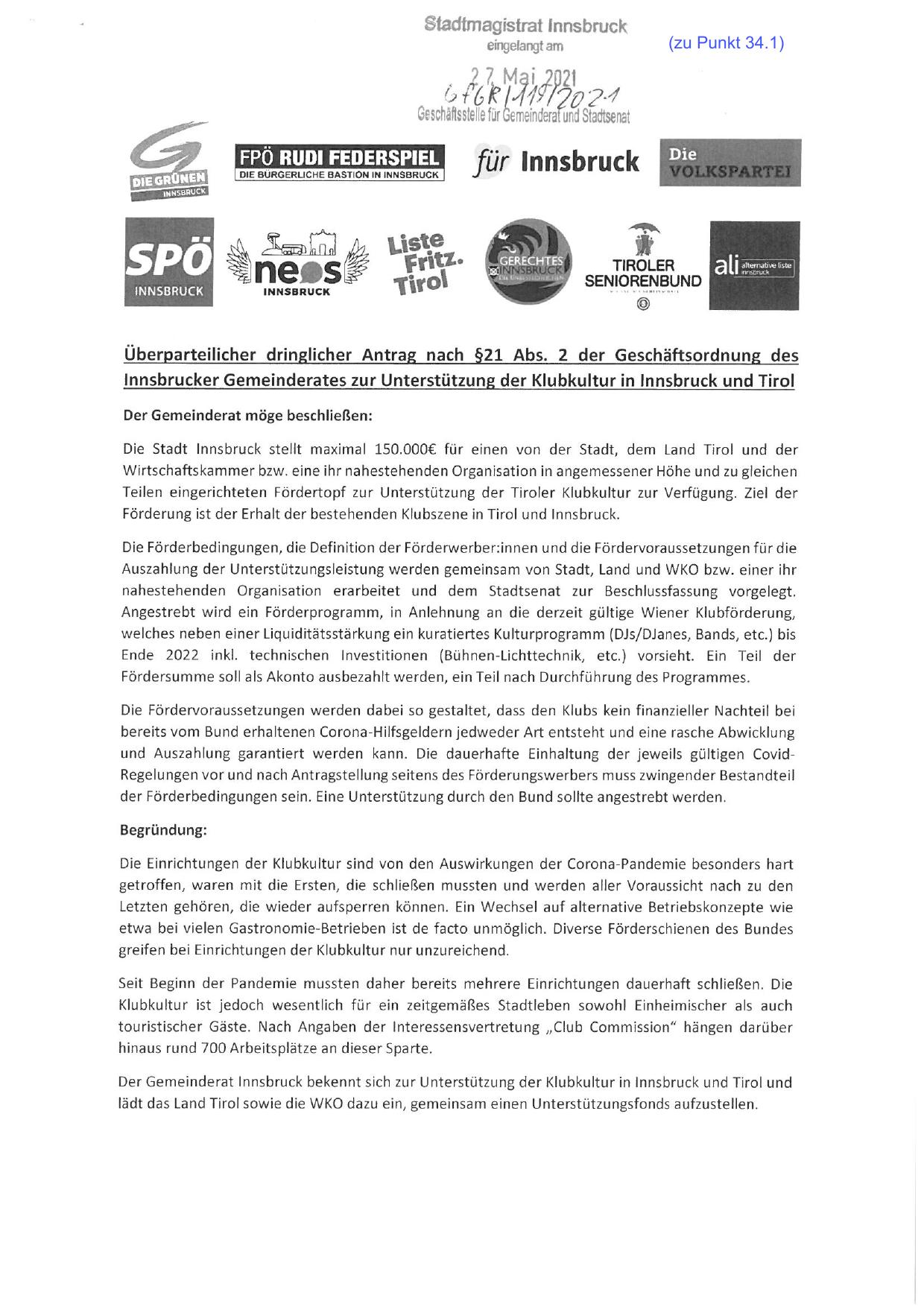 lnnsbrucker Gemeinderates zur Unterstützung der Klubkultur in Innsbruck und Tirol