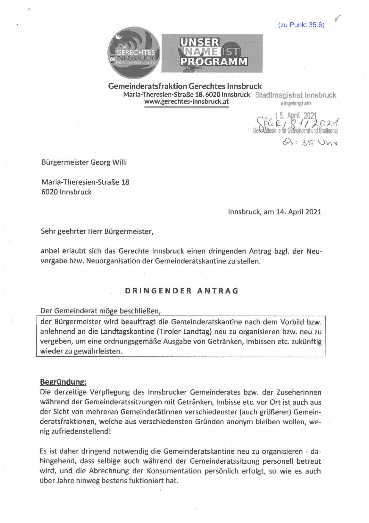 anbei erlaubt sich das Gerechte Innsbruck einen dringenden Antrag bzgl. der Neuvergabe bzw. Neuorganisation der Gemeinderatskantine zu stellen.