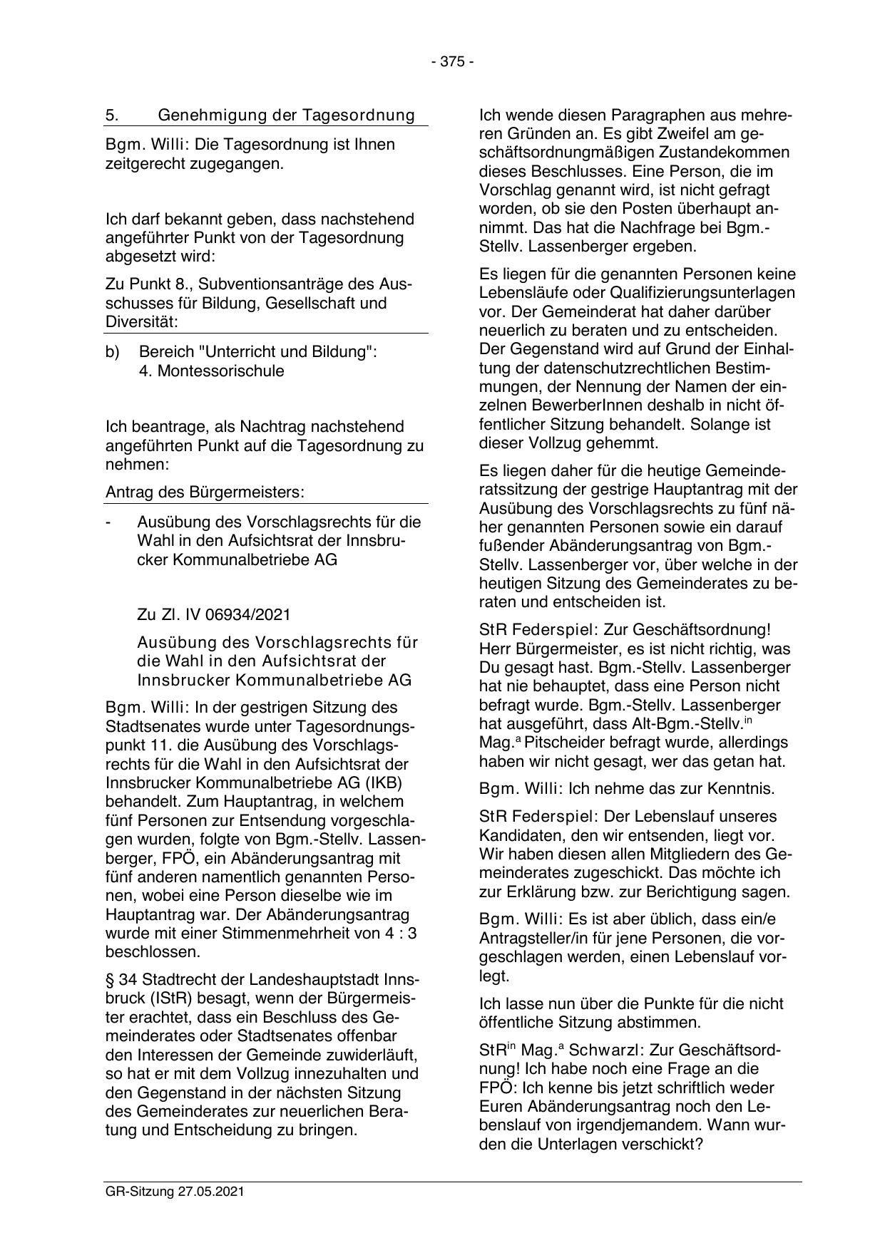 § 34 Stadtrecht der Landeshauptstadt Innsbruck (IStR) besagt, wenn der Bürgermeister erachtet, dass ein Beschluss des Gemeinderates oder Stadtsenates offenbar